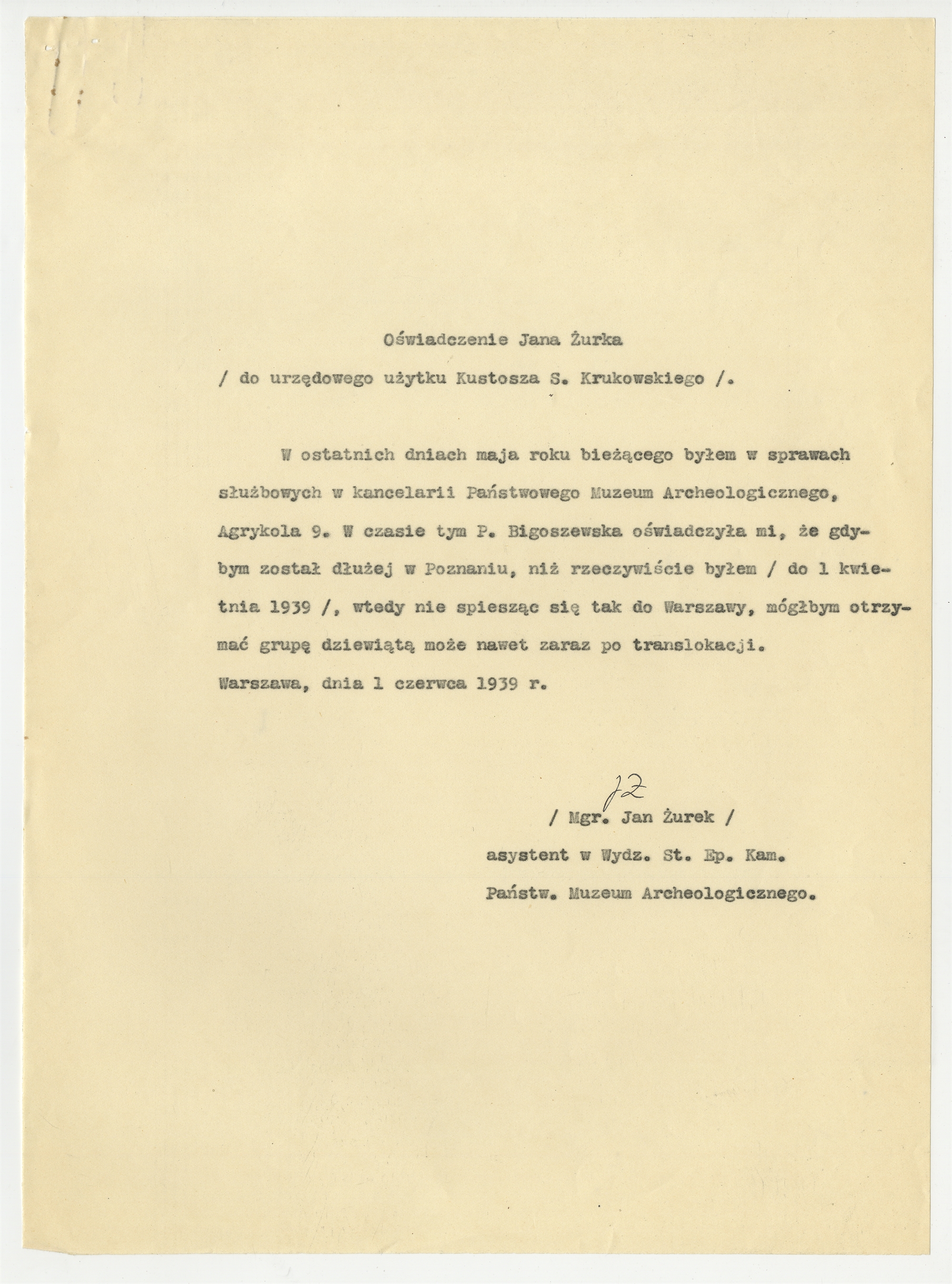 Maszynopis - oświadczenie Jana Żurka z dnia 1 czerwca 1939 roku