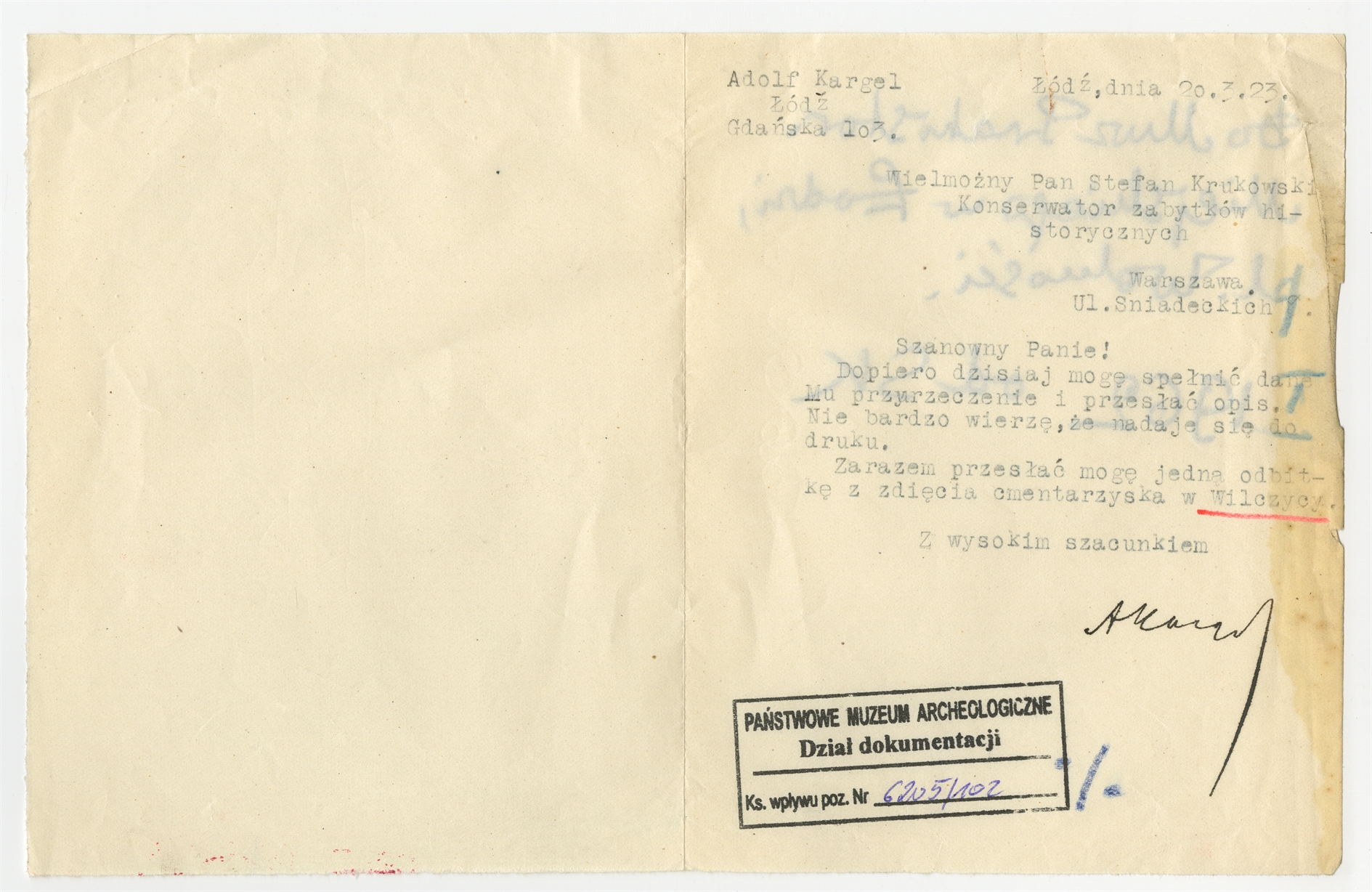Maszynopis pisma Adolfa Kargela do Konserwatora Zabytków historycznych S. Krukowskiego w sprawie opisu cmentarzyska w Wilczycy - strona 1: "Dopiero dzisiaj" … "Z wysokim szacunkiem + rękopis podpisu" Łódź 20.3.[10]23 (bez numeru strony)