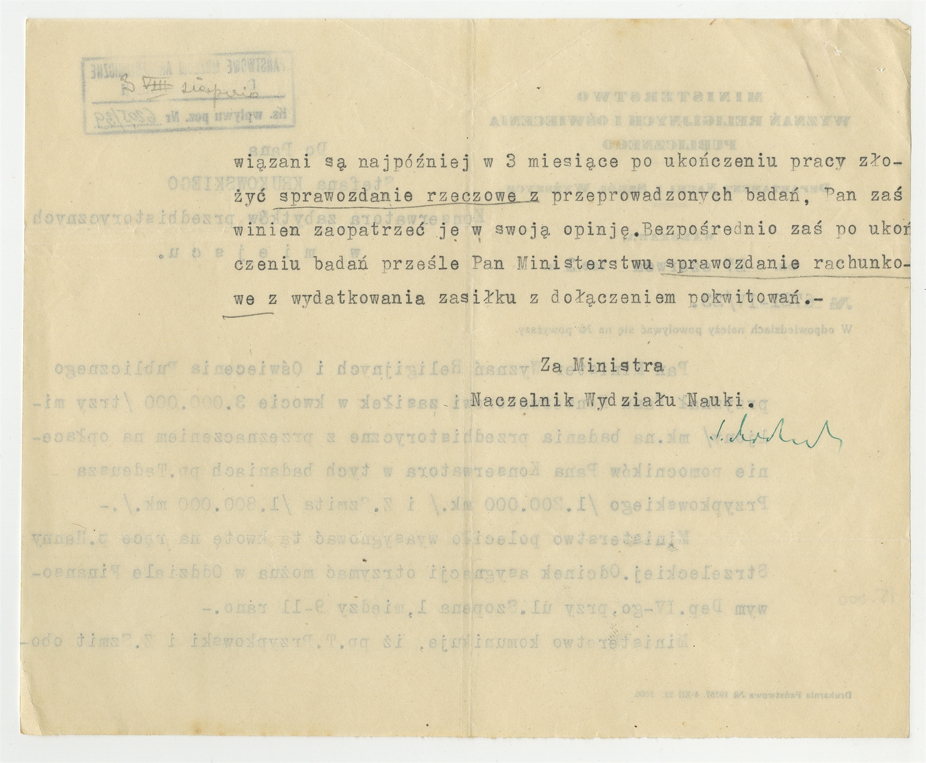 Maszynopis pisma Departamentu Nauki i Szkół Wyższych Ministerstwa Wyznań Religijnych i Oświecenia Publicznego do Stefana Krukowskiego Konserwatora Zabytków Przedhistorycznych w sprawie przyznania zasiłku na badania terenowe z przeznaczeniem na opłacenie pomocników pp. T. Przypkowskiego oraz Z. Szmita Warszawa 27 czerwca 1923 r. - strona 2
