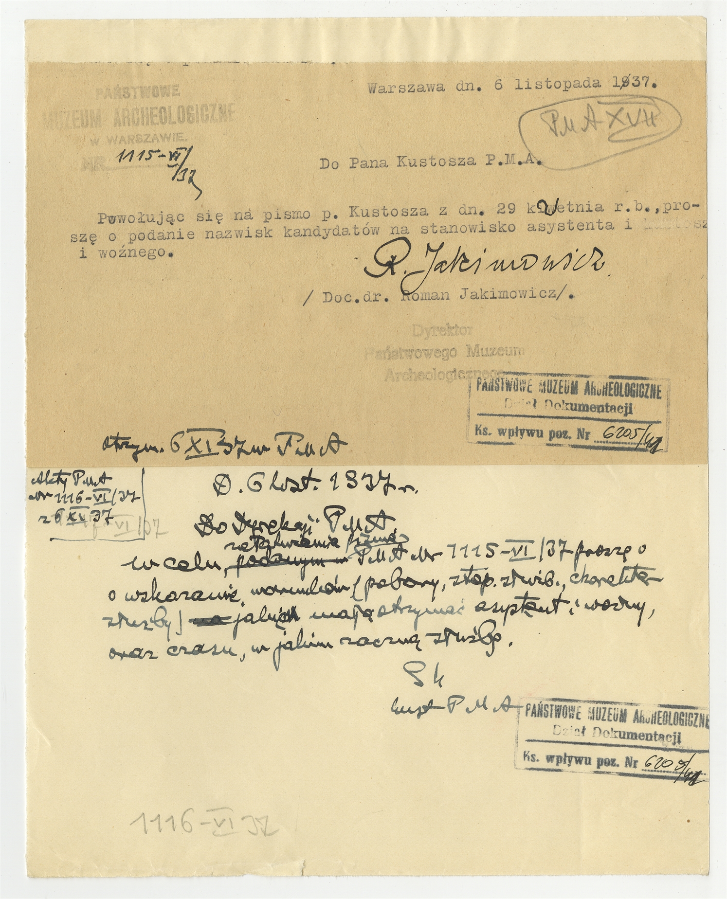 Maszynopis pisma Dyrektora PMA R Jakimowicza do Kustosza PMA Stefana Krukowskiego z dn. 6 listopada 1937 r. (PMA Nr 1115-VI/37) wraz z rękopisem-brudnopisem odpowiedzi S. Krukowskiego