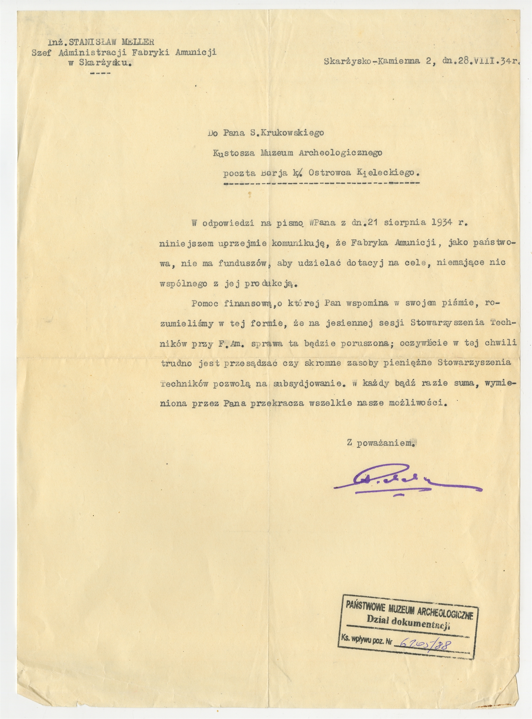 Maszynopis pisma inż. Stanisława Mellera Szefa Administracji Fabryki Amunicji w Skarżysku do Stefana Krukowskiego Kustosza PMA w sprawie braku możliwości udzielenia subsydium na cele niezwiązne z produkcją Fabryki Skarżysko-Kamienna 28 VIII [19]34 r. - strona 1