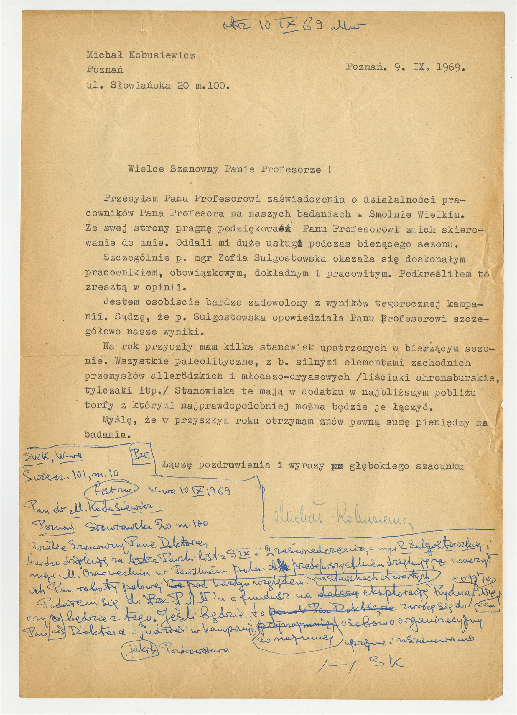 Maszynopis pisma Michała Kobusiewicza do S. Krukowskiego w sprawie zaświadczeń o działalności pracowników S. Krukowskiego na badaniach w Smolnie Wielkim wraz z brudnopisem odpowiedzi S. Krukowskiego - strona 1: zatytułowana "Wielce Szanowny Panie Profesorze" "Przesyłam Panu Profesorowi" ... "Pozdrowienia uprzejme i uszanowanie - SK" Poznań. 9. IX 1969