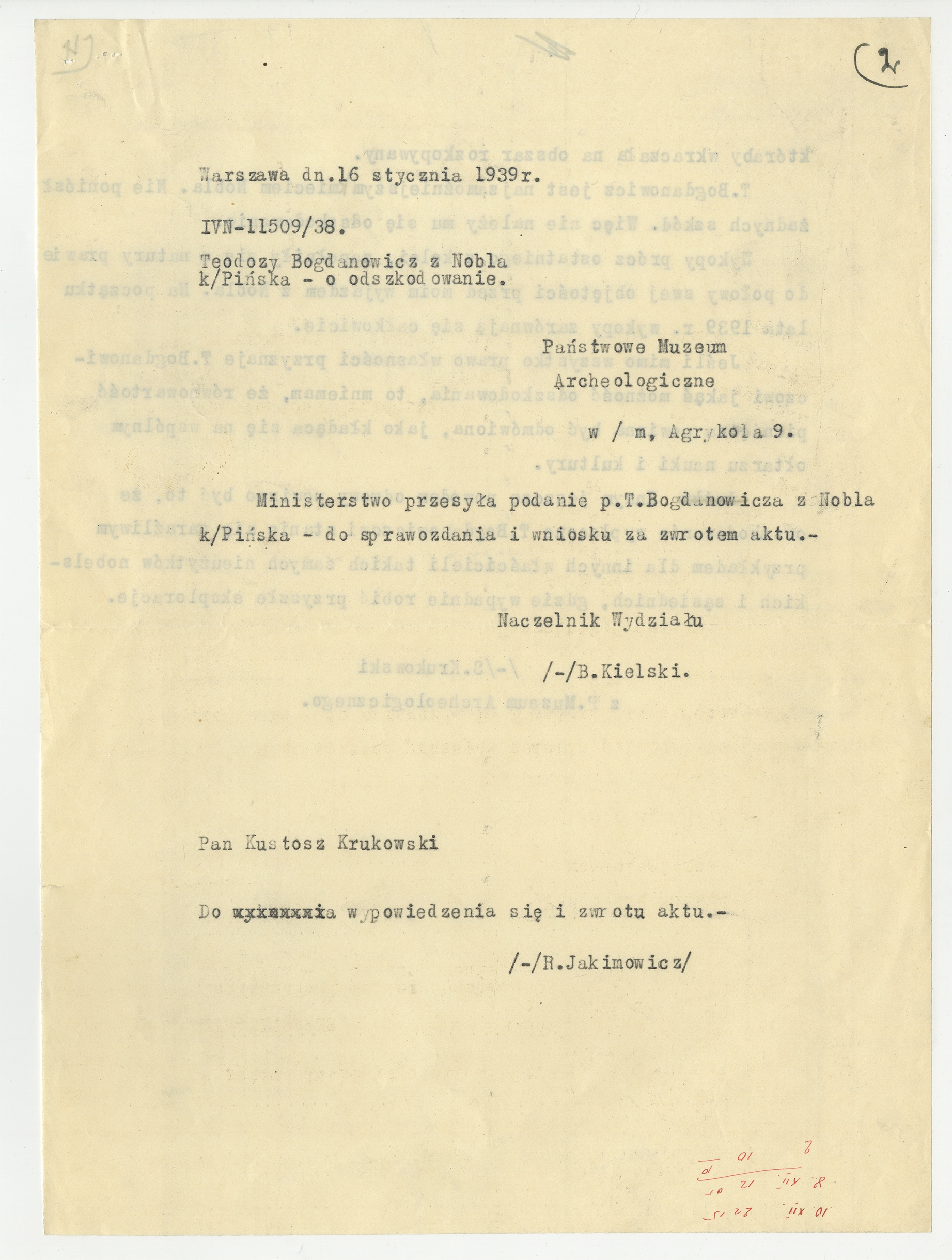Maszynopis pisma od B. Kielskiego - Naczelnika Wydziału Nauk w Ministerstwie Wyznań Religijnych i Oświecenia Publicznego w Warszawie pismo Nr IVN -11509/38 z dn 16 I 1939 r. skierowane do PMA
