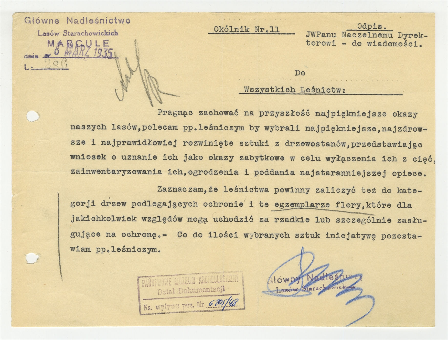 Maszynopis pisma (Okólnik Nr. 11) Głównego Nadleśnictwa Lasów Starachowickich MARCULE do Wszystkich Leśnictw w sprawie zachowania najpiękniejszych okazów z drzewostanów uznania ich jako okazy zabytkowe i poddania opiece - strona 1: "Pragnąć zachować na przyszłość" ... "inicjatywę pozostawiam pp. leśniczym" Marcule 8 marzec 1935