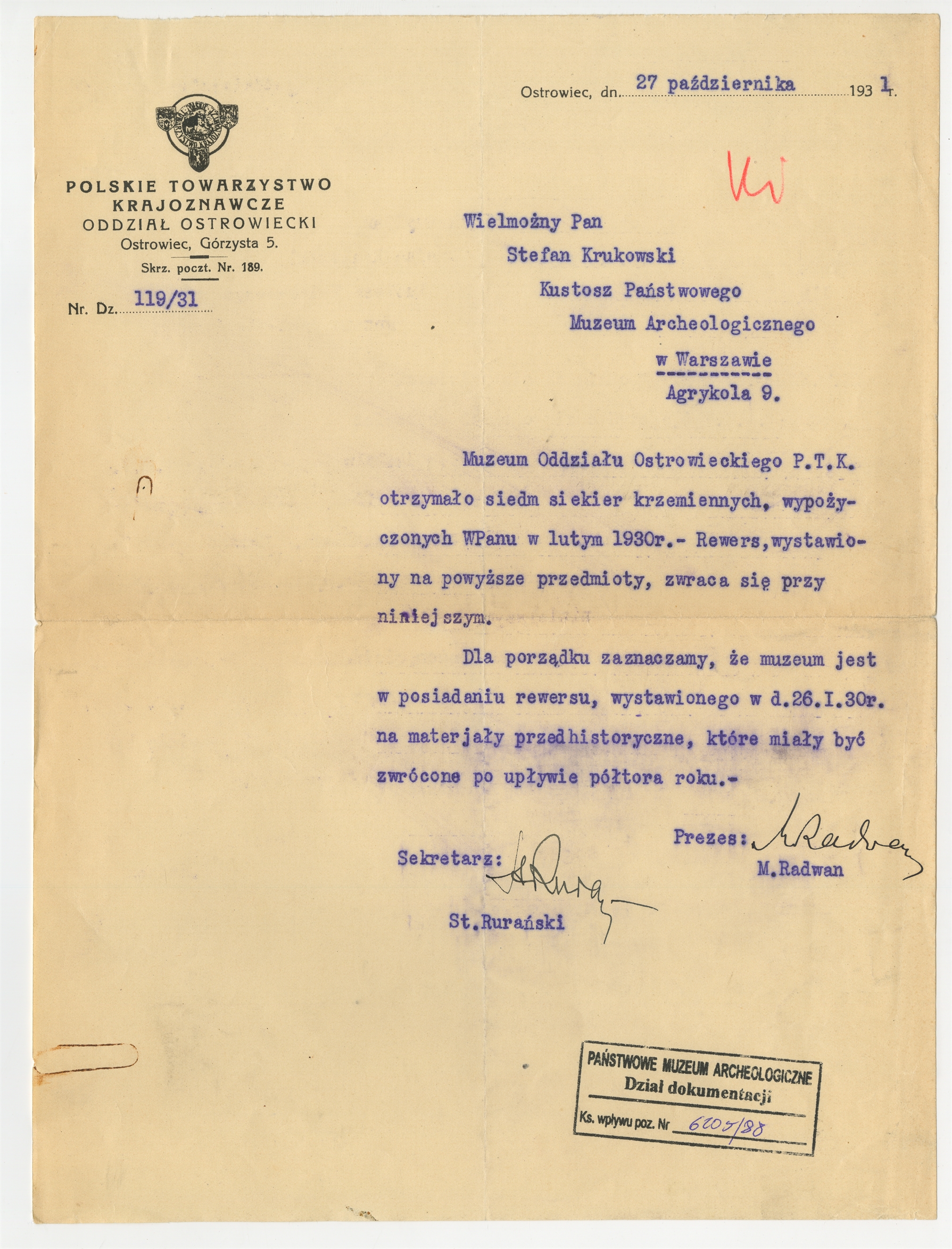 Maszynopis pisma Polskiego Towarzystwa Krajoznawczego Oddziału Ostrowieckiego do Stefana Krukowskiego Kustosza PMA z potwierdzeniem zwrotu siedmiu siekier krzemiennych wypożyczonych przez Krukowskiego w lutym 1930 r. Ostrowiec 27 października 1931 r. (nr pisma 119/31) - strona 1
