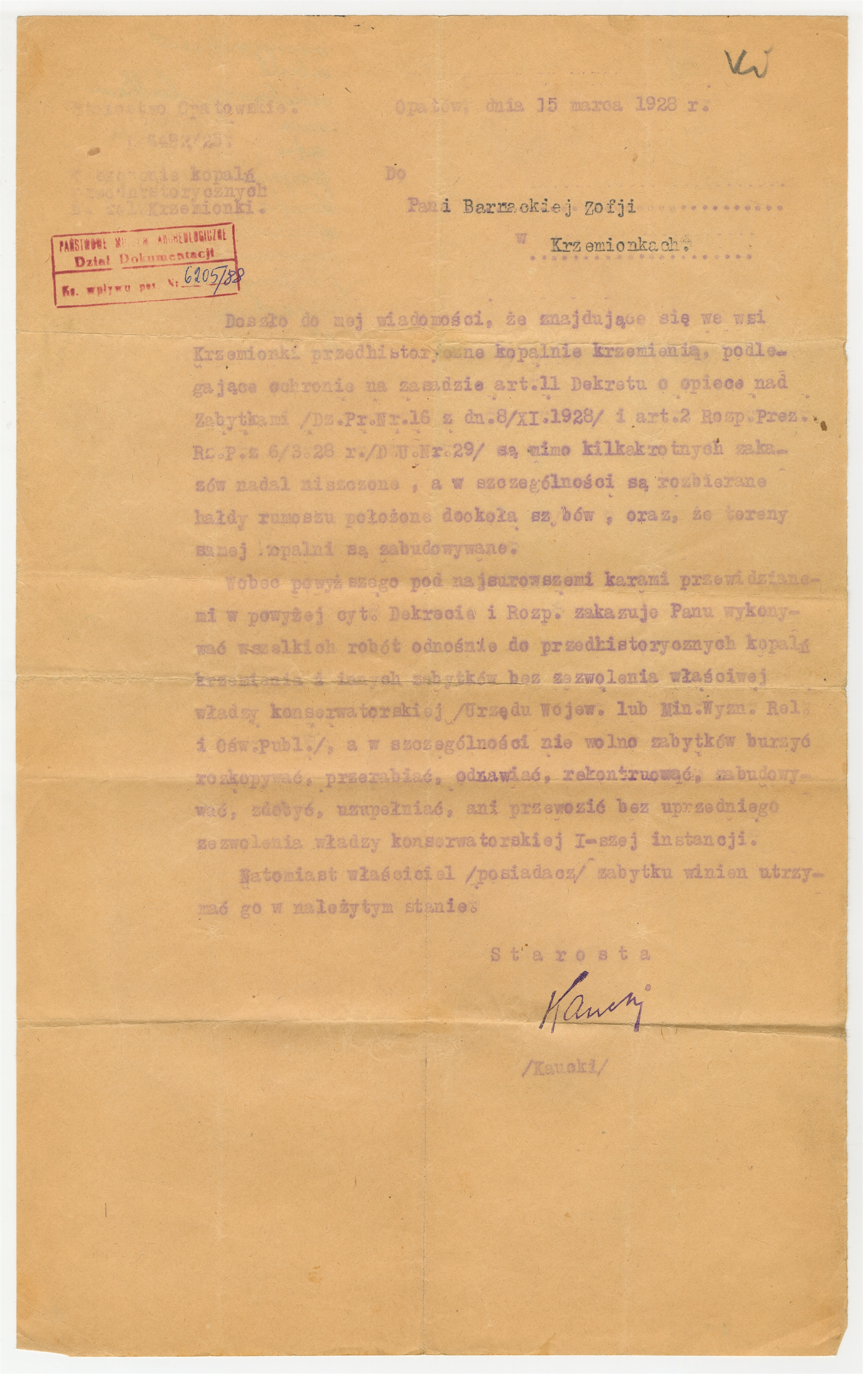Maszynopis pisma Starostwa Opatowskiego do p. Zofii Barnackiej z Krzemionek z zkazem wykonaywania wszelkich robót prowadzących do zniszczenia kopalni krzemienia i innych zabytków Opatów 15 marca 1928 r. (nr pisma 6492/25) - strona 1
