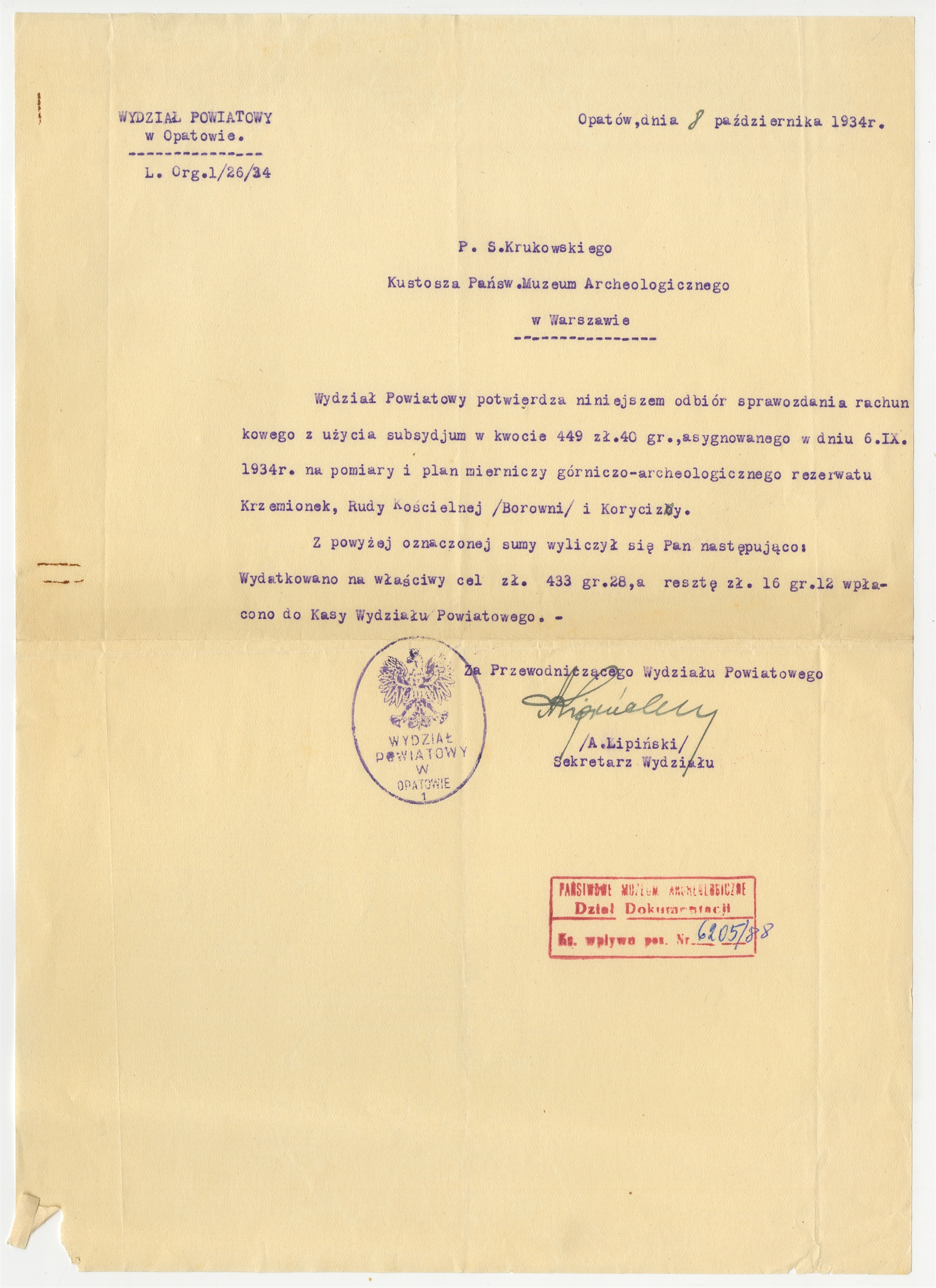 Maszynopis pisma Wydziału Powiatowego w Opatowie do Stefana Krukowskiego Kustosza PMA z potwierdzeniem otrzymania sprawozdania rachunkowego z użycia subsydium a pomiary i plan mierniczy górniczo-archeologicznego rezerwatu Krzemionek Rudy Kościelnej /Borowni/ i Korycizny Opatów 8 października 1934 r. (nr pisma 1/26/34) - strona 1