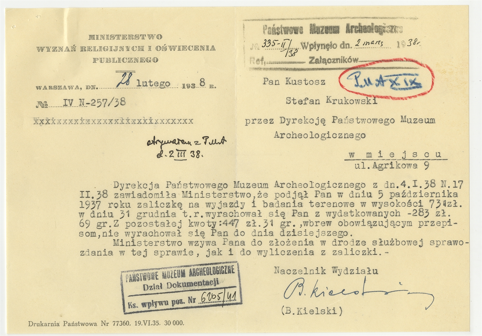 Maszynopis pisma z 28 lutego 1938 r. z Ministerstwa Wyznań Religijnych i Oświecenia Publicznego (Pismo Nr IV N-257/38 oraz PMA Nr 335-II/38) skierowane do Kustosza Stefana Krukowskiego.