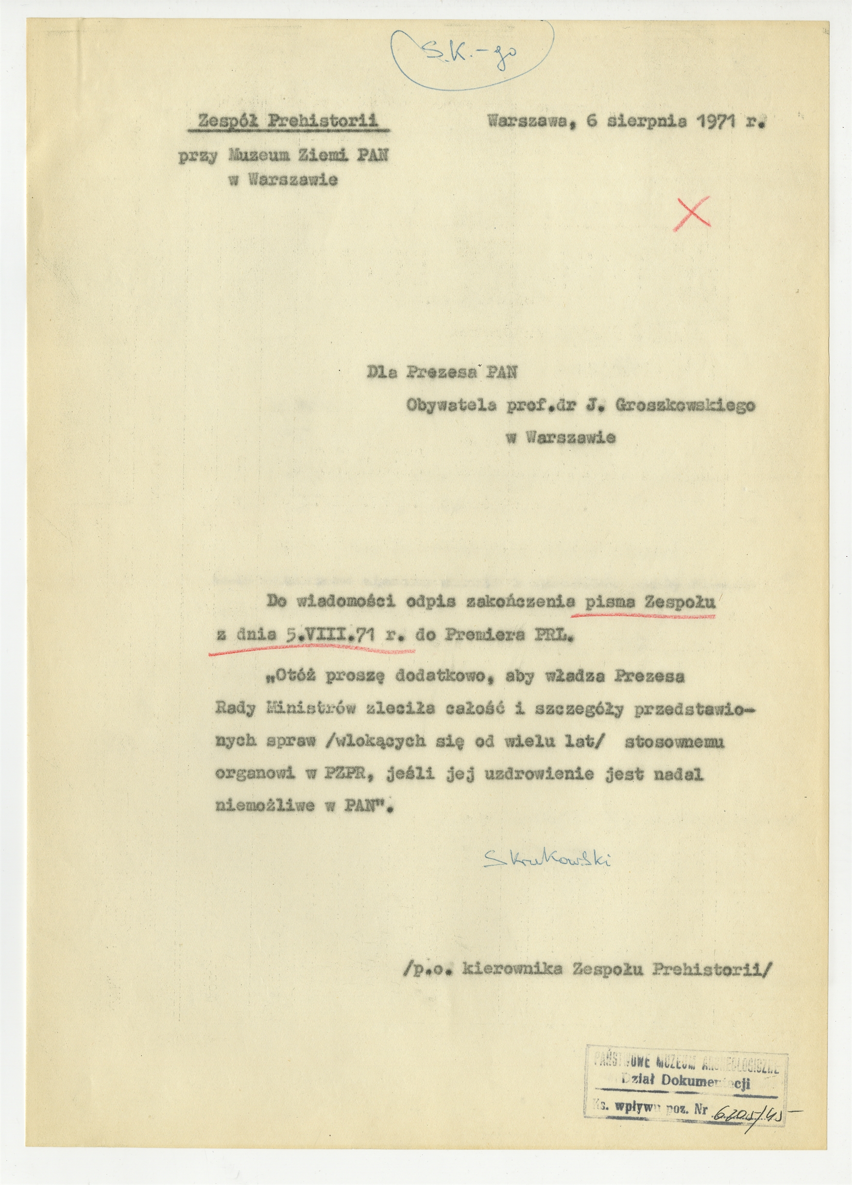 Maszynopis pisma Zespołu Prehistorii przy Muzeum Ziemi PAN do Prezesa PAN prof. dr J.Groszkowskiego w sprawie odpisu zakończenia pisma Zespołu z dnia 5. VIII. 71 r do Premiera PRL - strona 1: zatytułowana "Dla Prezesa PAN (…)" "Do wiadomości odpis" … "jest nadal niemożliwe w PAN" Warszawa 6 sierpnia 1971 (bez numeru strony)