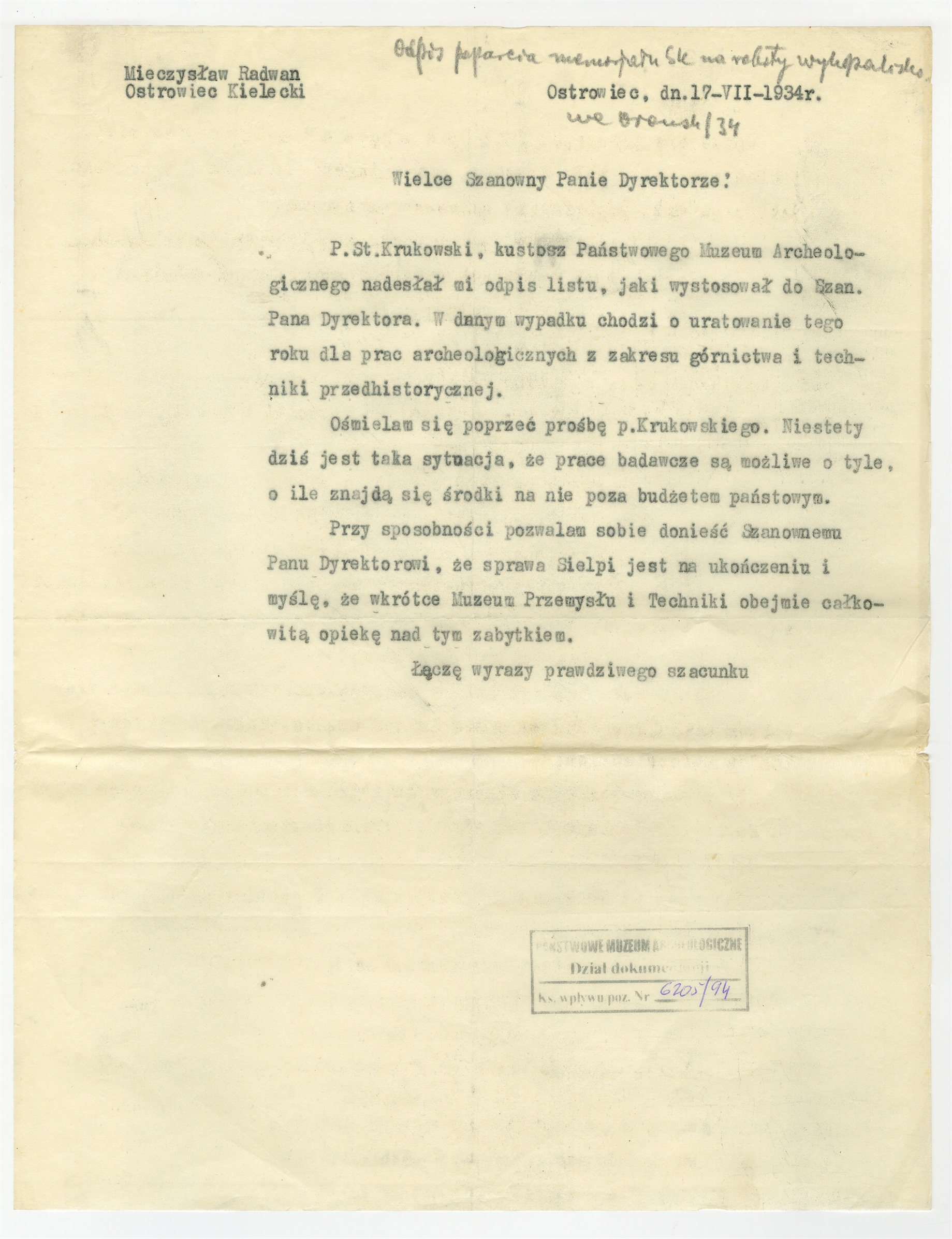 Maszynopis - pismo Mieczysława Radwana do prof. Stefana Krukowskiego Ostrowiec 17 VII 1934 r.