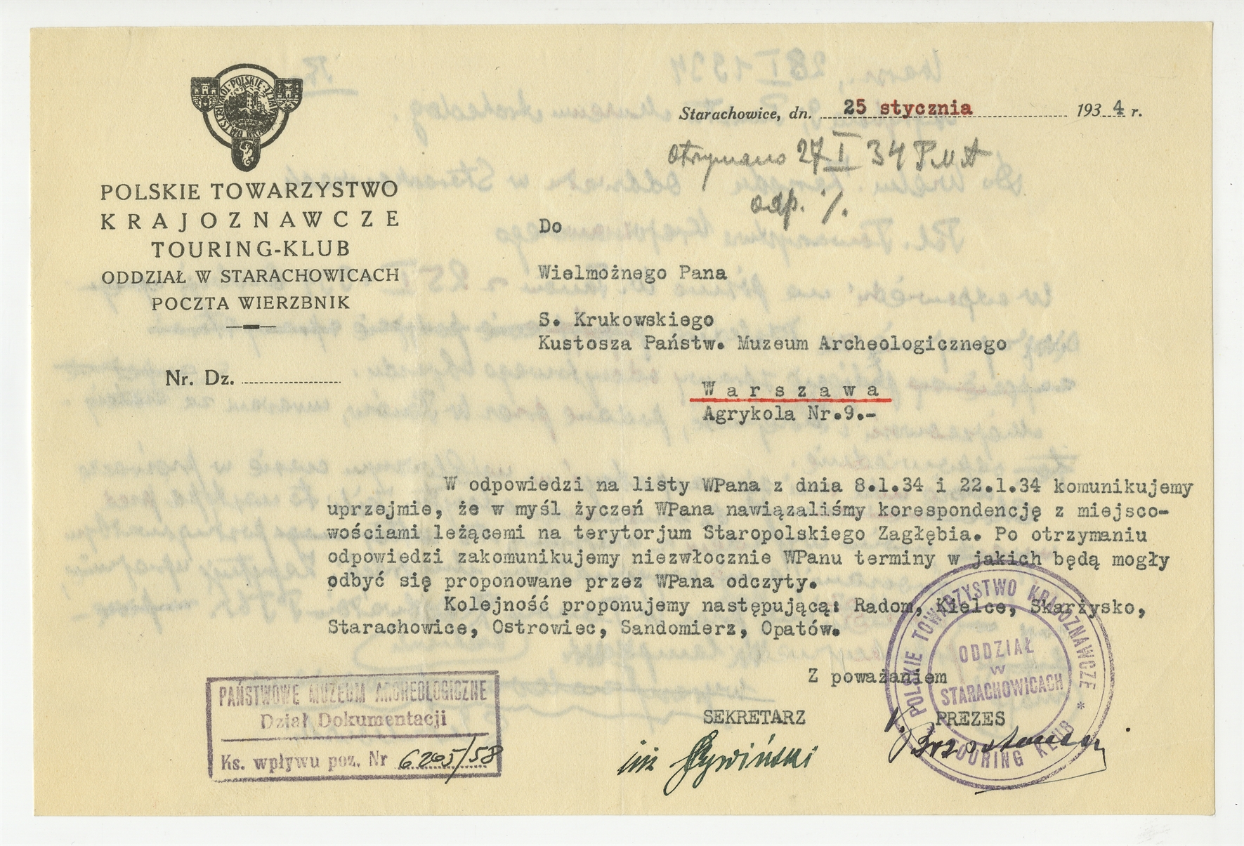 Maszynopis - pismo Polskiego Towarzystwa Krajoznawczego Touring - Klub do prof. Stefana Krukowskiego Starachowice 25 I 1934 r.