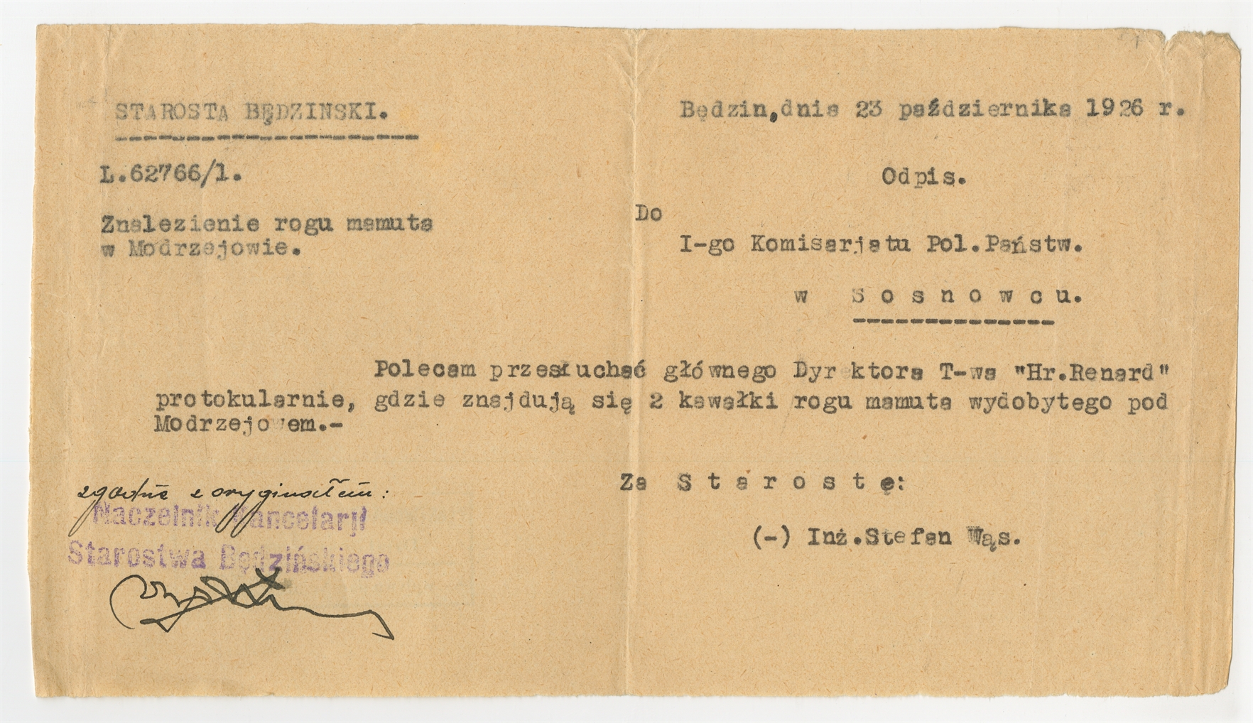 Maszynopis - pismo Starosty Będzińskiego do I-go Komisariatu Pol. Państw. W Sosnowcu Będzin 23 X 1926