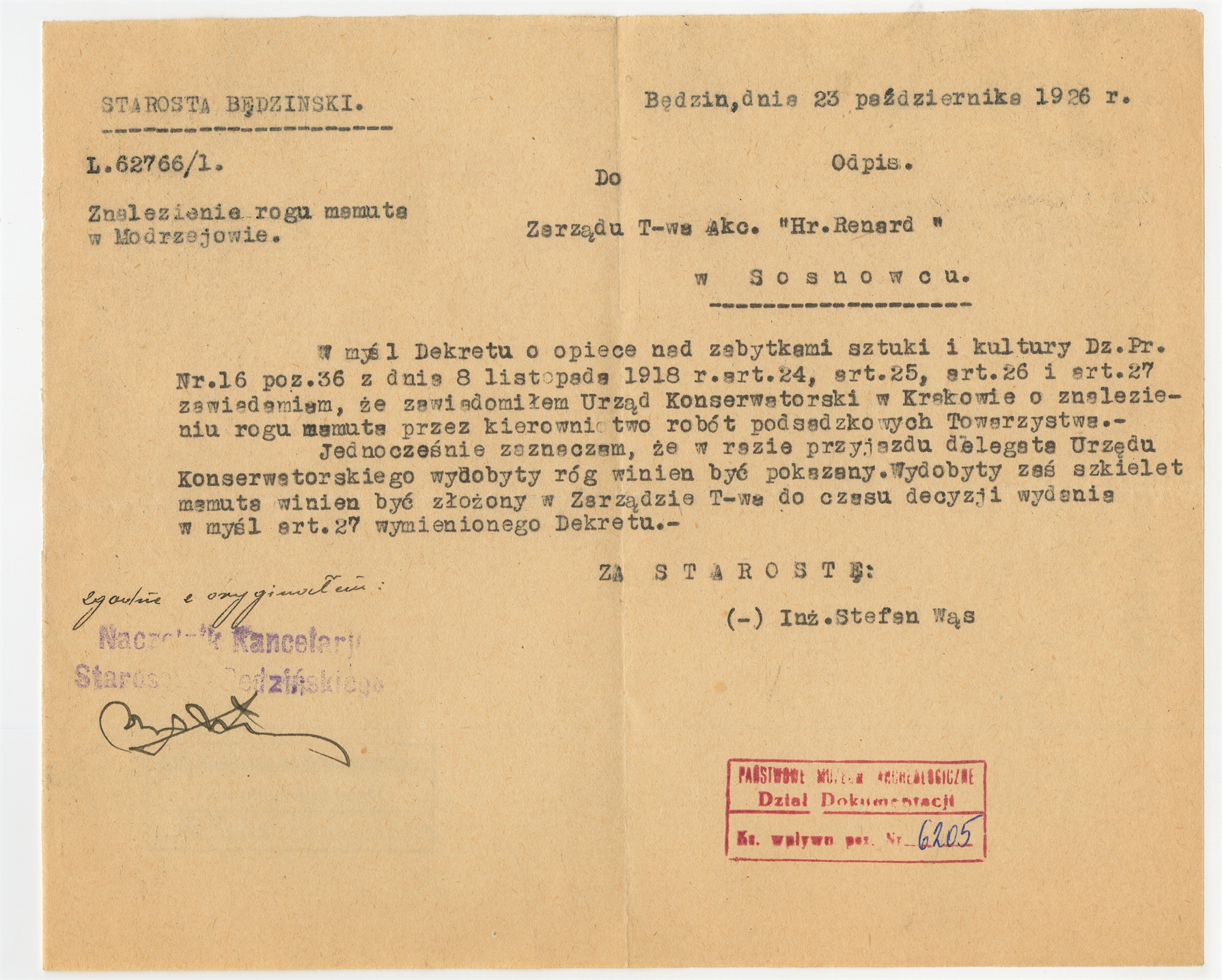 Maszynopis - pismo Starosty Będzińskiego do Zarządu T-wa Akc. "Hr. Renard" Będzin 23 X 1926 r.