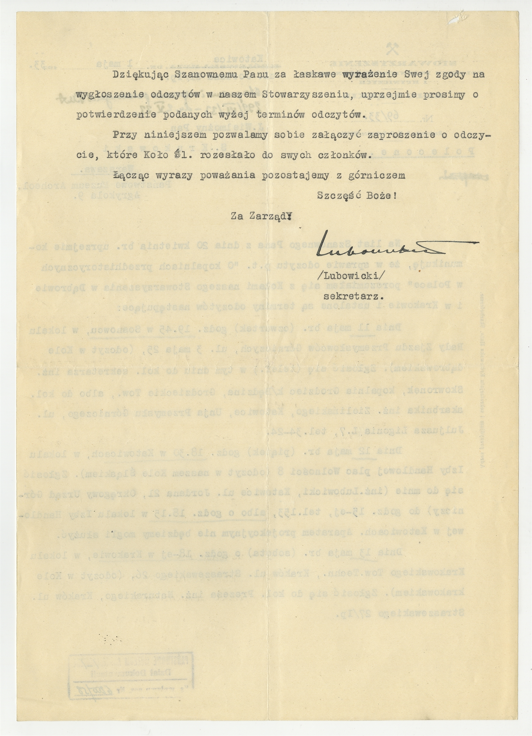 Maszynopis - pismo Stowarzyszenia Polskich Inżynierów Górniczych i Hutniczych Koło Śląskie do prof. Stefana Krukowskiego Katowice 1 V 1933 r. - c.d. "… Dziękując Szanownemu Panu…"