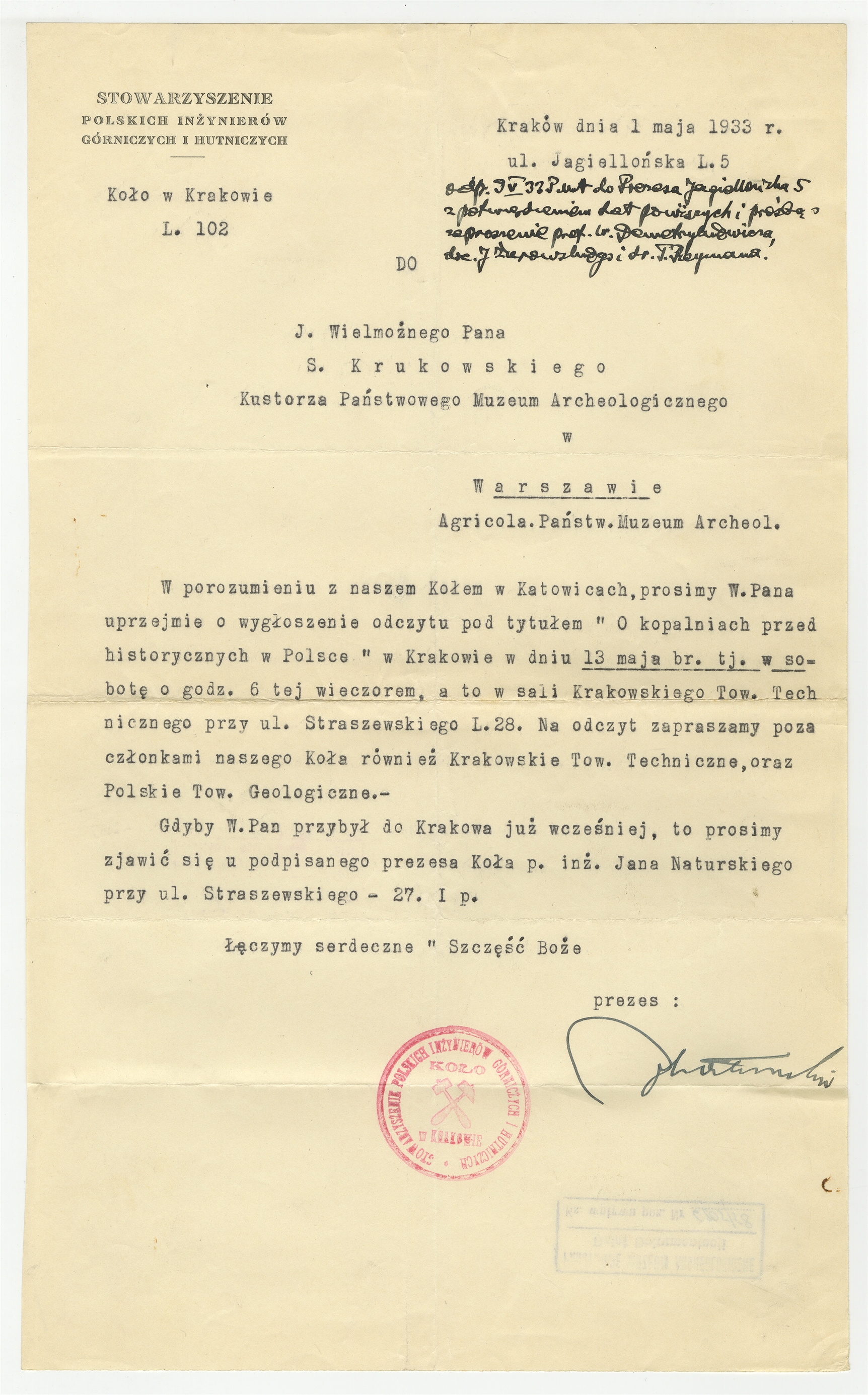Maszynopis - pismo Stowarzyszenia Polskich Inżynierów Górniczych i Hutniczych Koło w Krakowie do prof. Stefana Krukowskiego Kraków 1 V 1933 r.