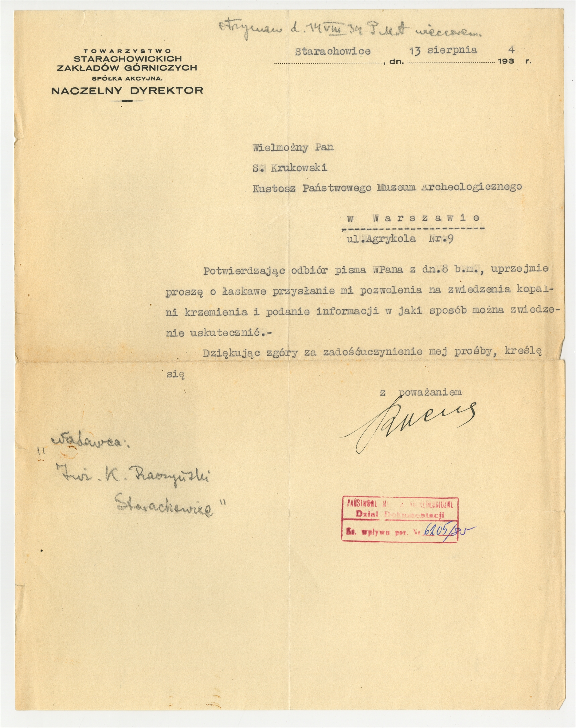 Maszynopis - pismo Towarzystwa Starachowickich Zakładów Górniczych do prof. Stefana Krukowskiego Starachowice 13 VIII 1934 r. z ręczną notatką