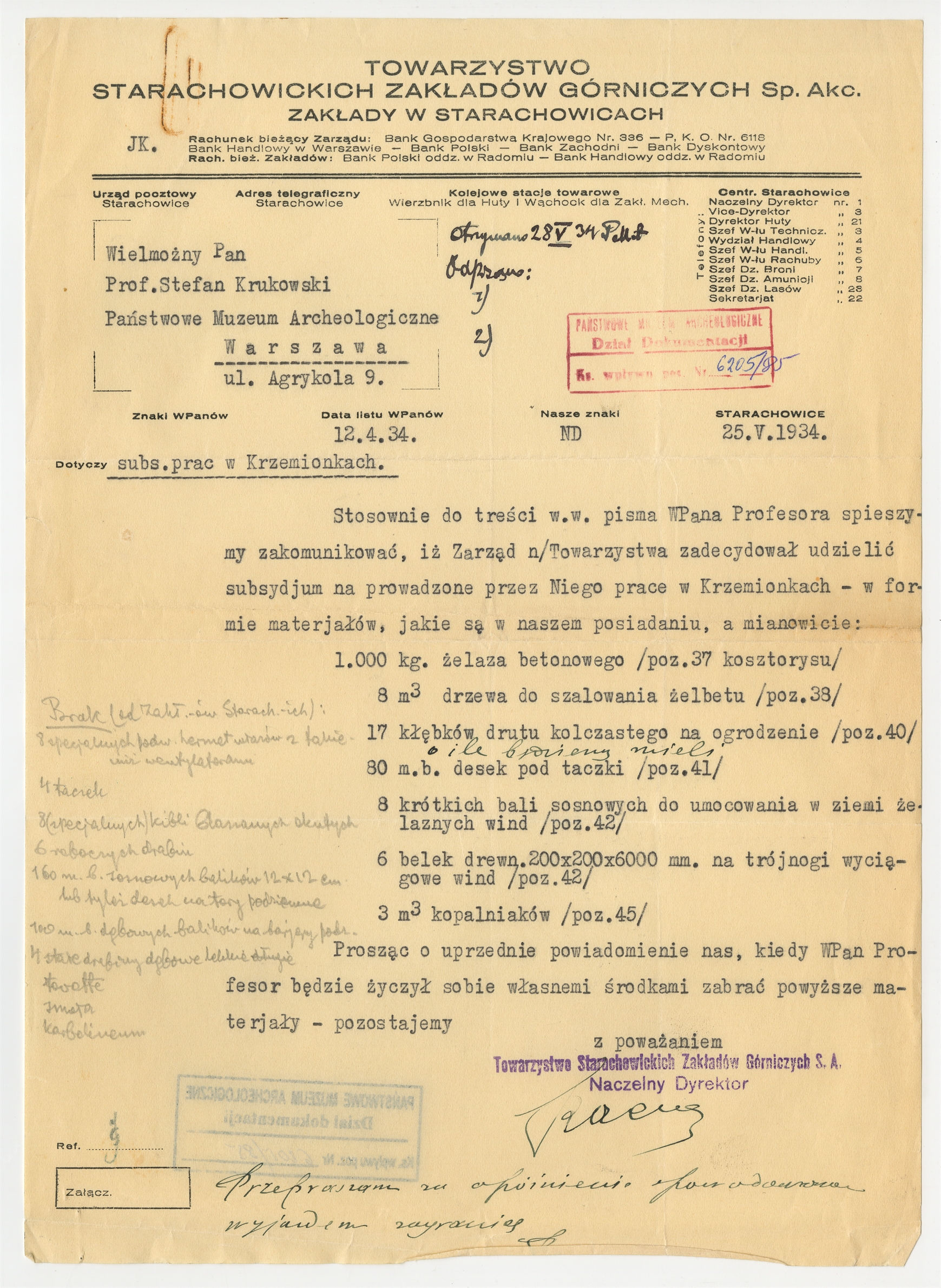 Maszynopis - pismo Towarzystwa Starachowickich Zakładów Górniczych do prof. Stefana Krukowskiego Starachowice 25 V 1934 r. z ręcznymi notatkami