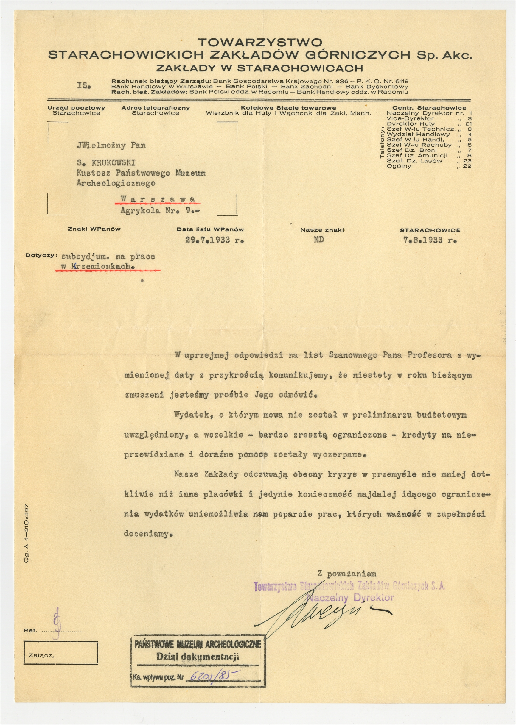 Maszynopis - pismo Towarzystwa Starachowickich Zakładów Górniczych do prof. Stefana Krukowskiego Starachowice 7 VIII 1933 r.