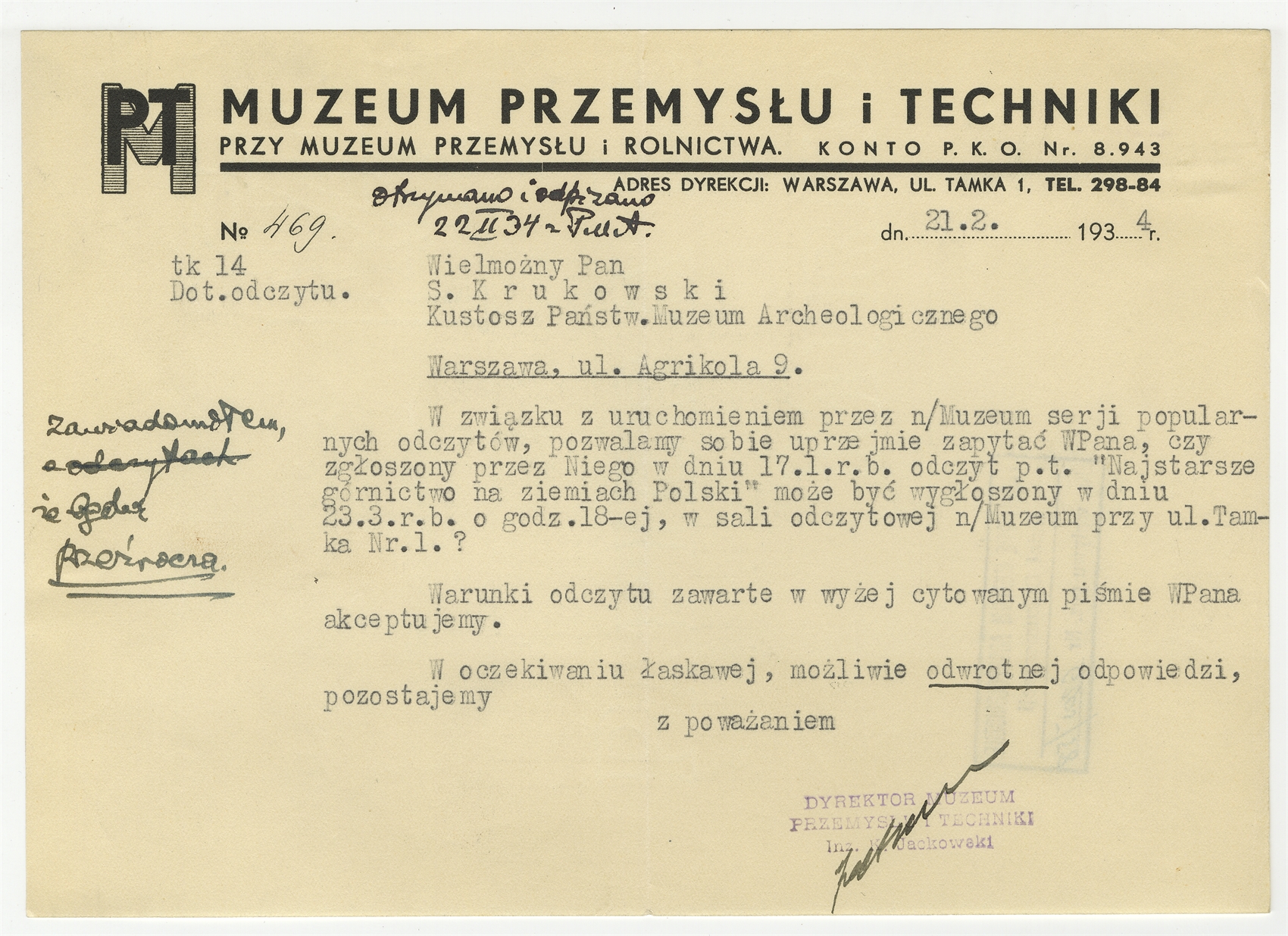 Maszynopis - pismo z Muzeum Przemysłu i Techniki do prof. Stefana Krukowskiego Warszawa 21 II 1934 r. notatka odręczna prof. Krukowskiego