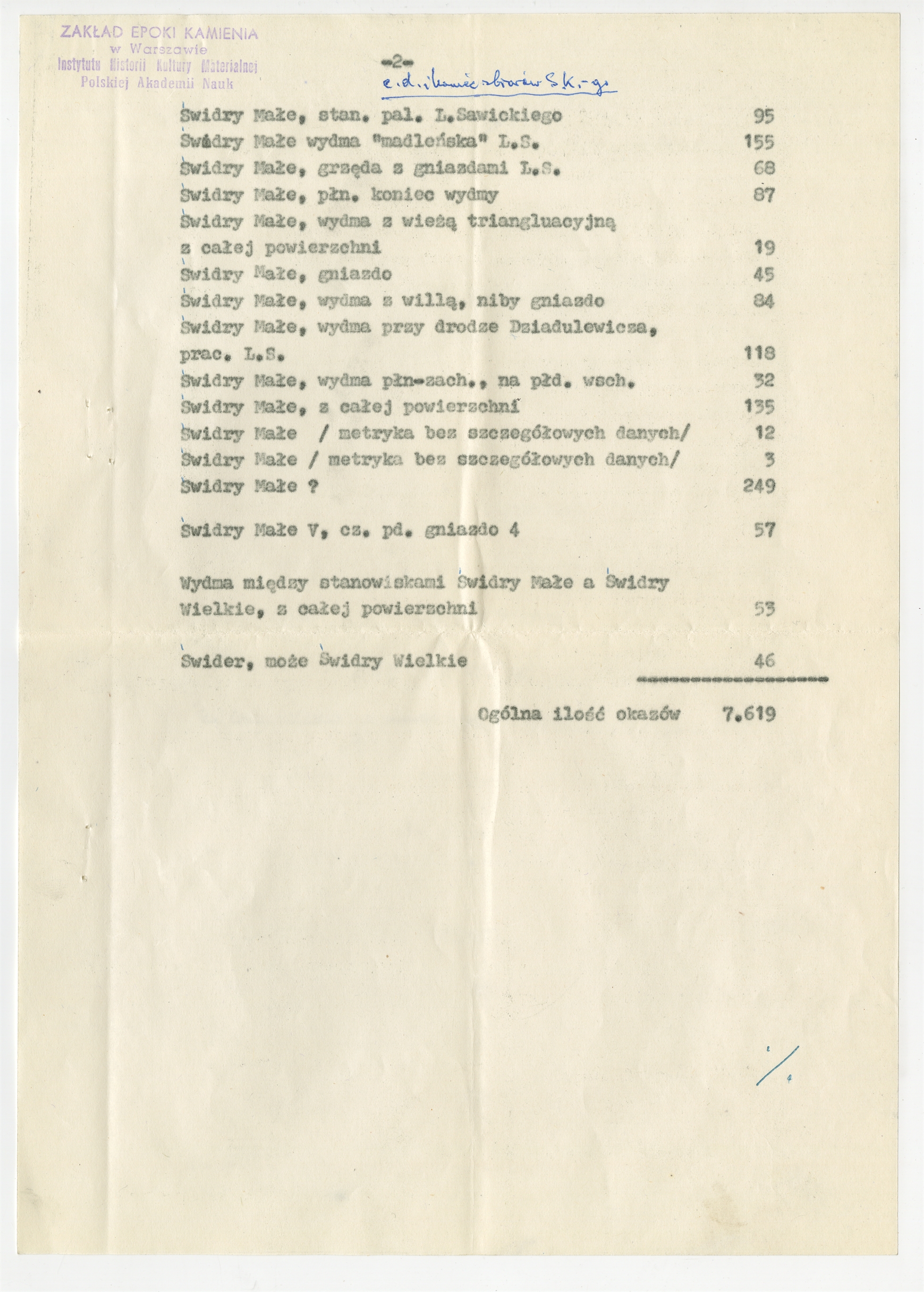 Maszynopis - pismo Zakladu Epoki Kamienia IHKM PAN do PMA z dnia 18 II 1972 roku - przekazanie w depozyt do PMA materiałów krzemiennych ze stanowisk Świdry Wielkie I Świdry wielkie II i Świdry Małe. Strona 2