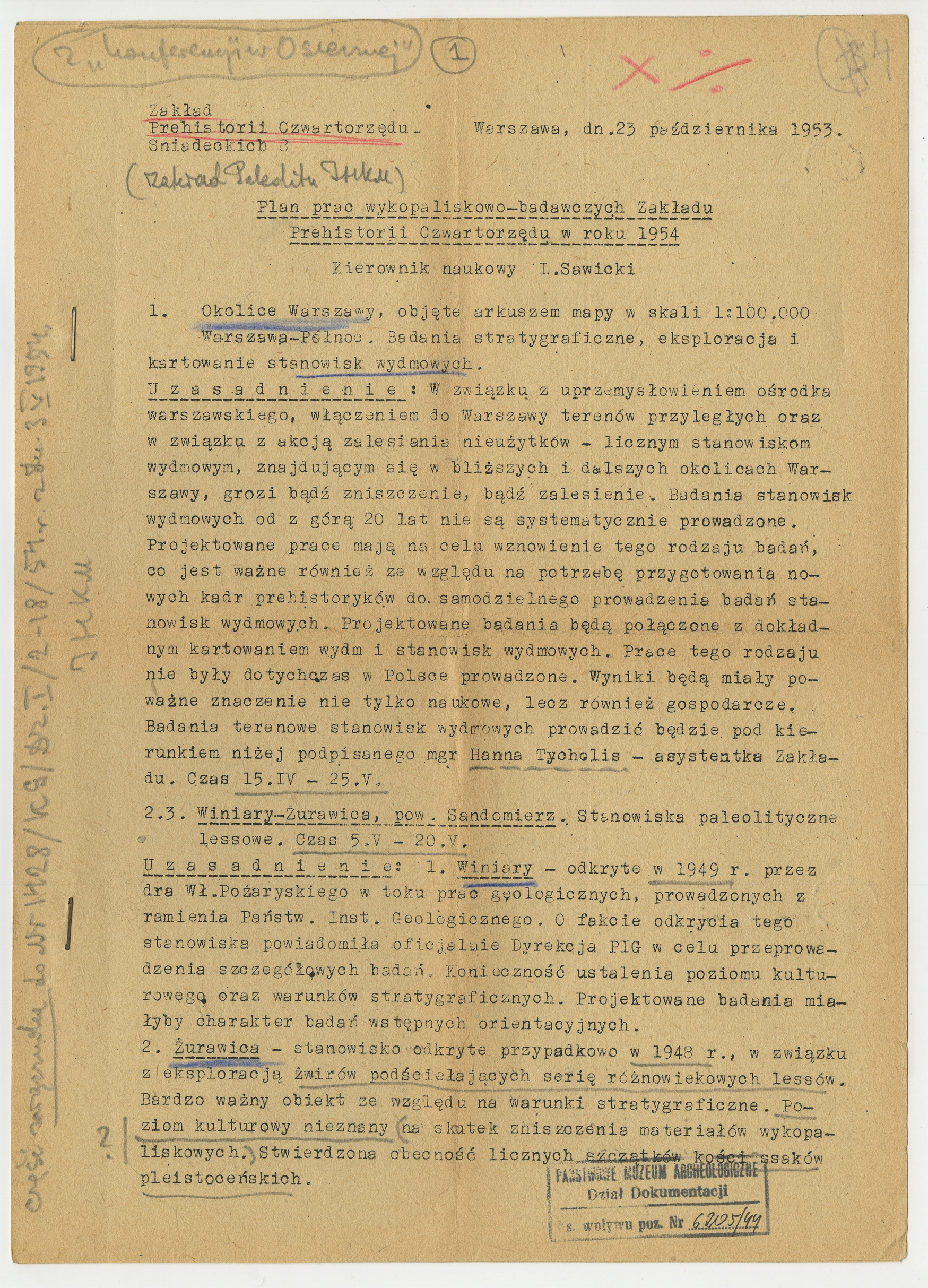 Maszynopis - Plan prac wykopaliskowo-badawczych Zakładu Prehistorii Czwartorzędu w roku 1954 z dn. 23 X 1953 r.; notatki odręczne Stefana Krukowskiego.