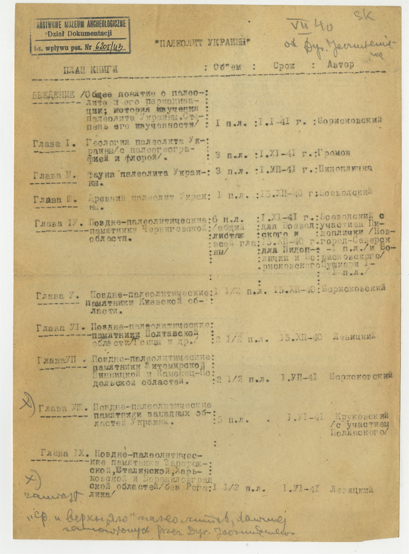 Maszynopis - plan w języku rosyjskim pracy "???????? ???????" (Paleolit Ukrainy) z roku 1940 "do dyr.. Jaczmieniewa (?) - strona 1