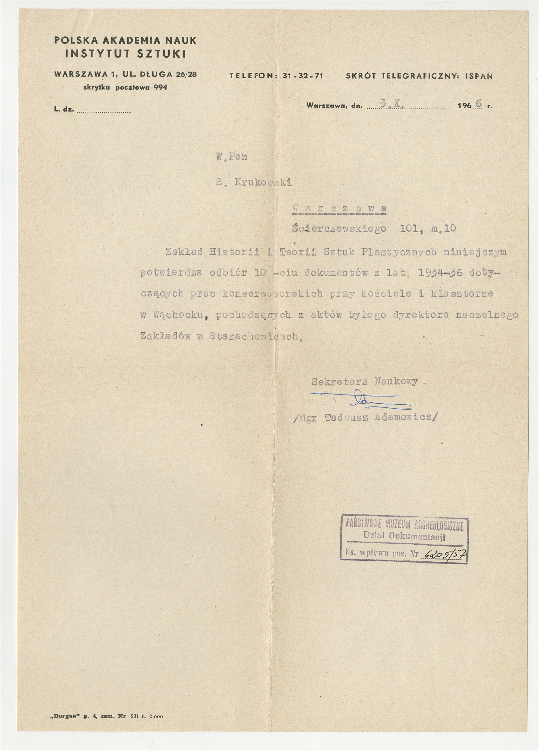 Maszynopis - potwierdzenie z dnia 3 X 1966 roku odbioru przez Instytut Sztuki PAN 10-ciu dokumentów z lat 1934-36 dotyczących prac konserwatorskich w Wąchocku