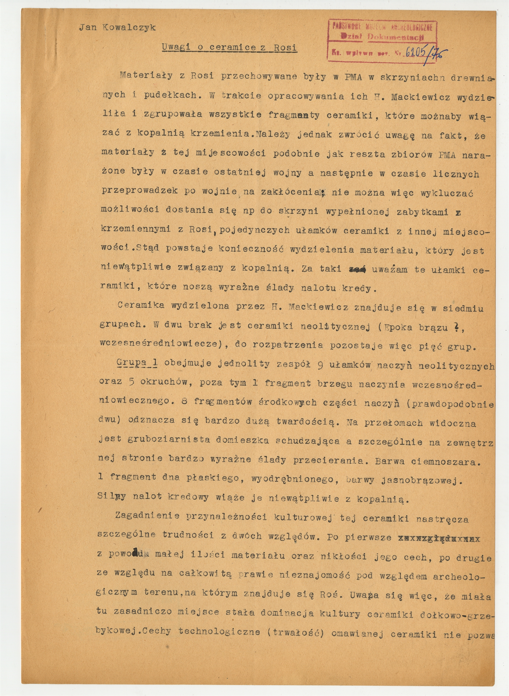Maszynopis - praca Jana Kowalczyka z dnia 4 grudnia 1959 roku pt.: Uwagi o ceramice z Rosi - strona 1