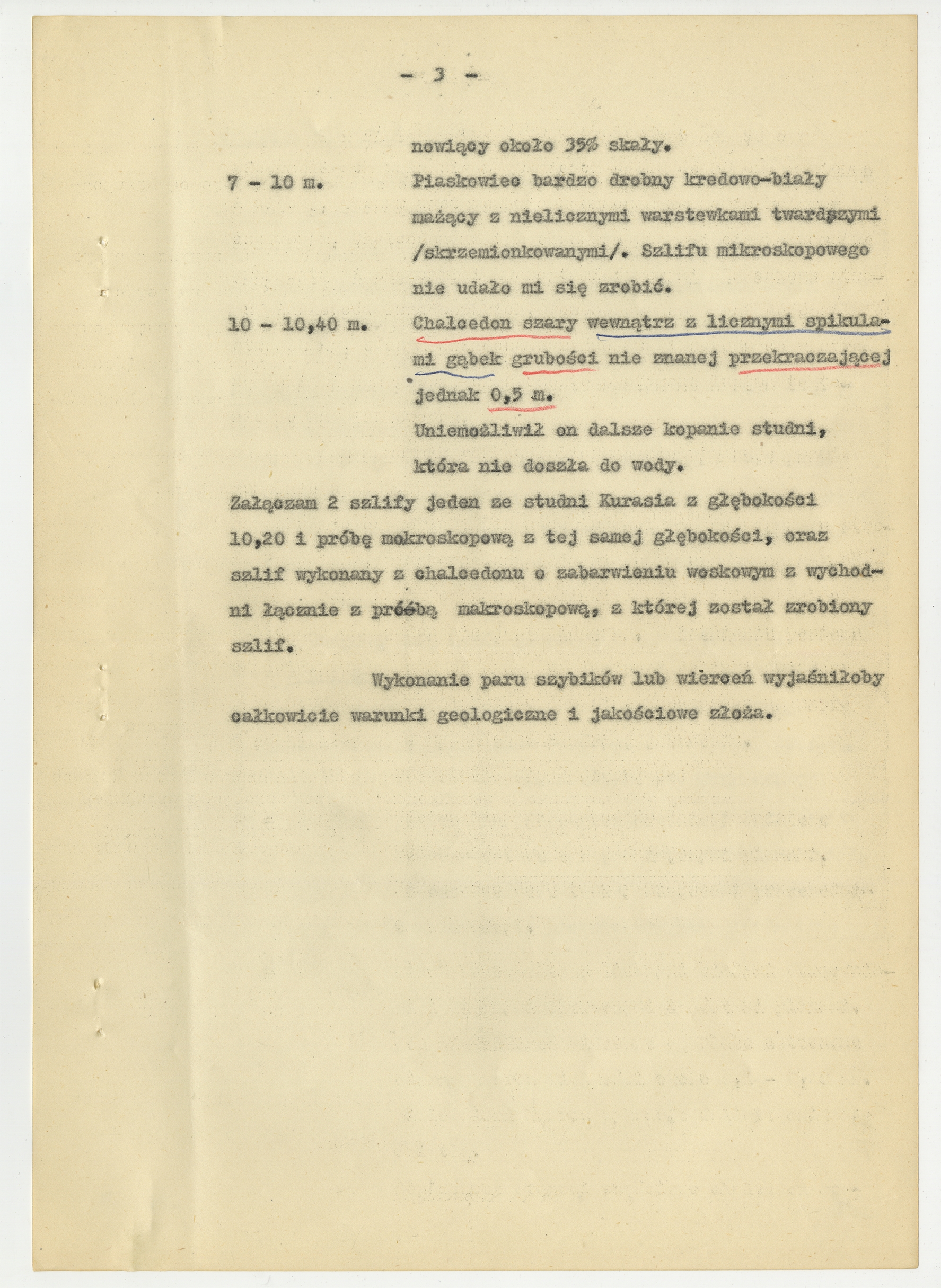 Maszynopis - praca Stefana Cieślińskiego „Notatka o występowaniu chalcedonu środkowo kredowego w okolicach Przedborza nad Pilicą". Strona 3