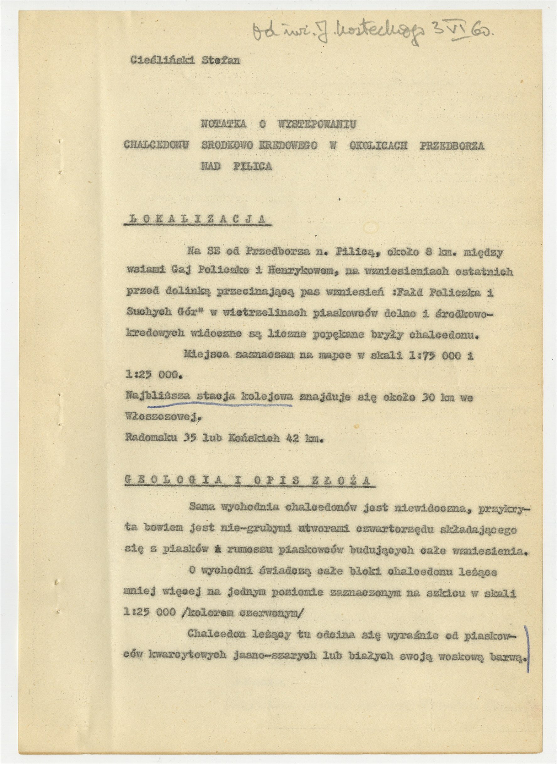 Maszynopis - praca Stefana Cieślińskiego „Notatka o występowaniu chalcedonu środkowo kredowego w okolicach Przedborza nad Pilicą". Strona tytułowa