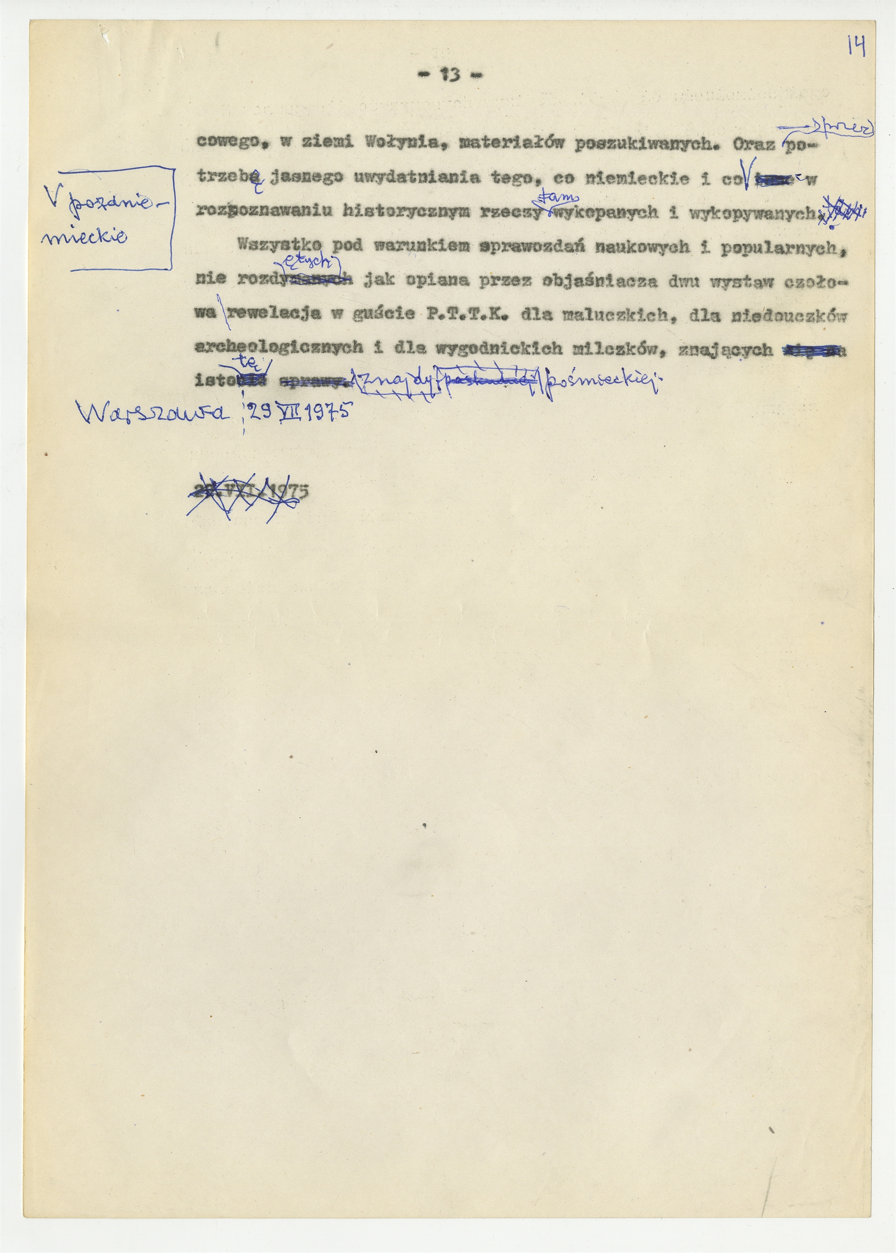 Maszynopis pracy pt. "Niemiecki Światowitek" (wersja 4) - strona 16: "(…) Oraz przez potrzebę jasnego uwydatniania tego co niemieckie (...)" Warszawa 29 VII 1975