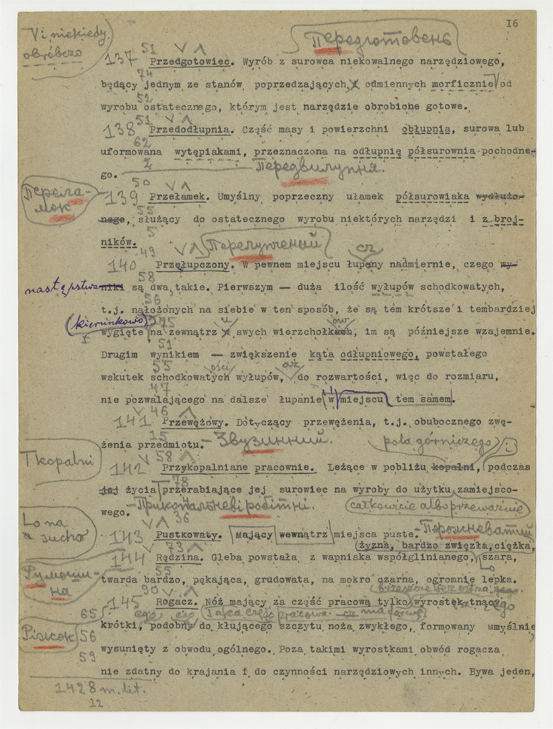 Maszynopis pracy S. Krukowskiego "Słownik prahistoryczny rozumowany do pracy S.K.: Kopalnia Zbuczi" rękopis - notatki (korekta) S. Krukowskiego w języku polskim i rosyjskim - strona 20: zawiera hasła "Przedgotowiec" … "Rogacz" (autorska strona 16)