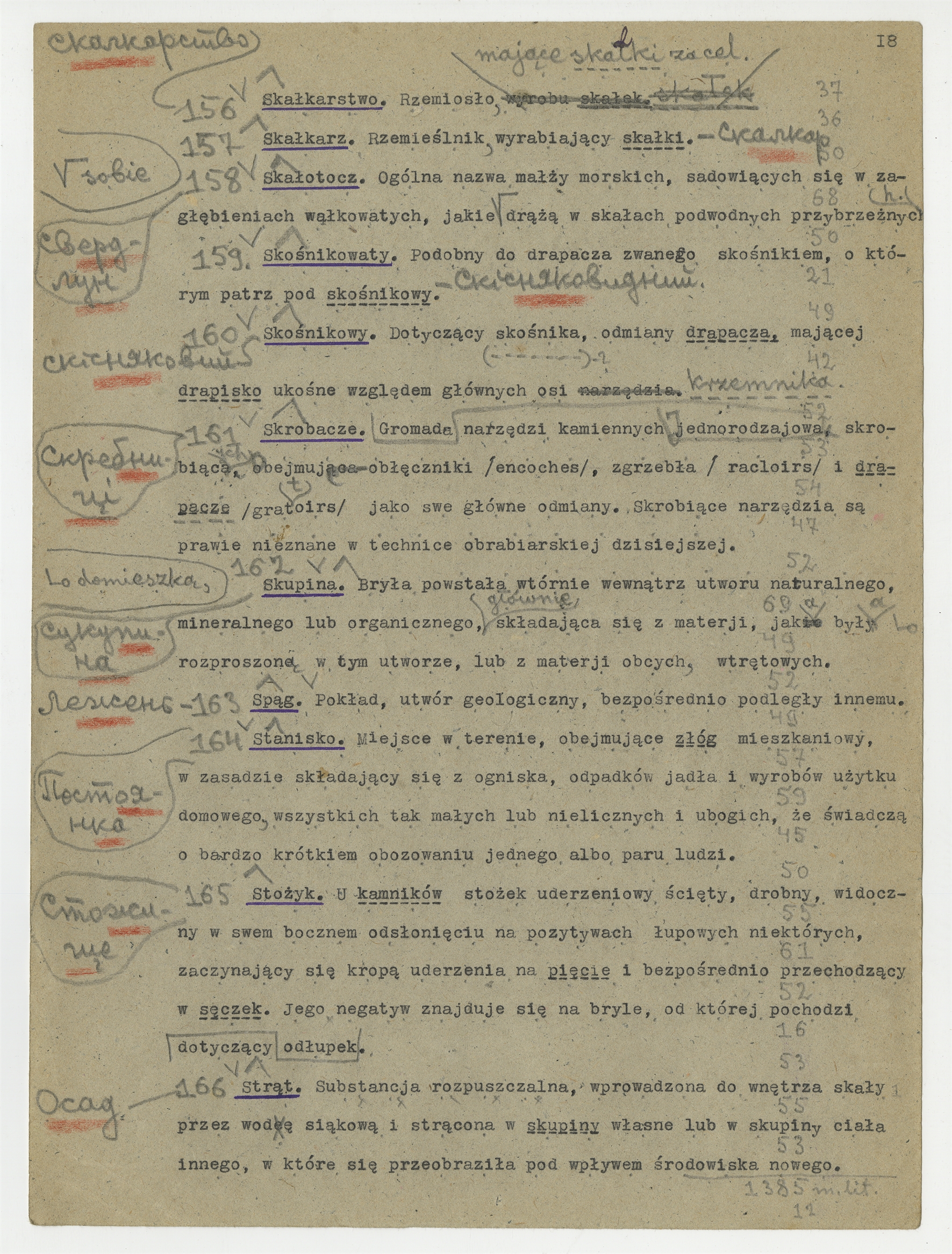 Element 22 - Maszynopis pracy S. Krukowskiego "Słownik prahistoryczny rozumowany do pracy S.K.: Kopalnia Zbuczi" rękopis - notatki (korekta) S. Krukowskiego w języku polskim i rosyjskim - strona 22: zawiera hasła "Skałkarstwo" … "Strąt" (autorska strona 18)