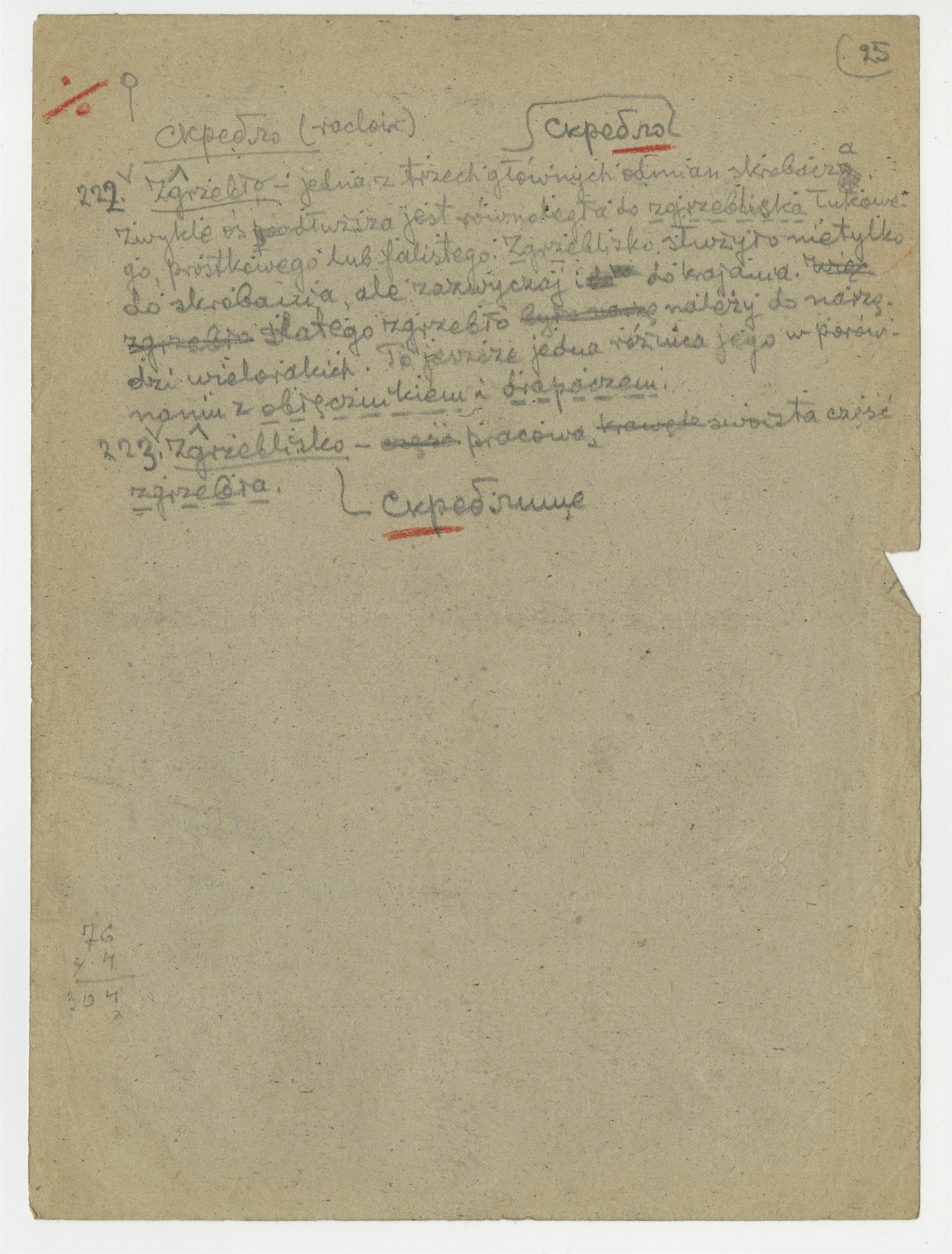 Maszynopis pracy S. Krukowskiego "Słownik prahistoryczny rozumowany do pracy S.K.: Kopalnia Zbuczi" rękopis - notatki (korekta) S. Krukowskiego w języku polskim i rosyjskim - strona 29: rękopis - brudnopis zawiera hasła "Zgrzebło" ... "Zgrzeblisko" (autorska strona 25)