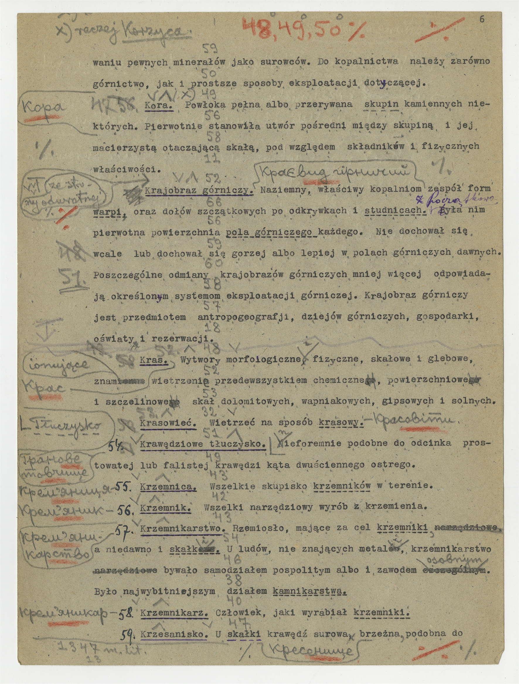 Maszynopis pracy S. Krukowskiego "Słownik prahistoryczny rozumowany do pracy S.K.: Kopalnia Zbuczi" rękopis - notatki (korekta) S. Krukowskiego w języku polskim i rosyjskim - strona 8: zawiera hasła "Kora" … "Krzesanisko" (autorska strona 6)