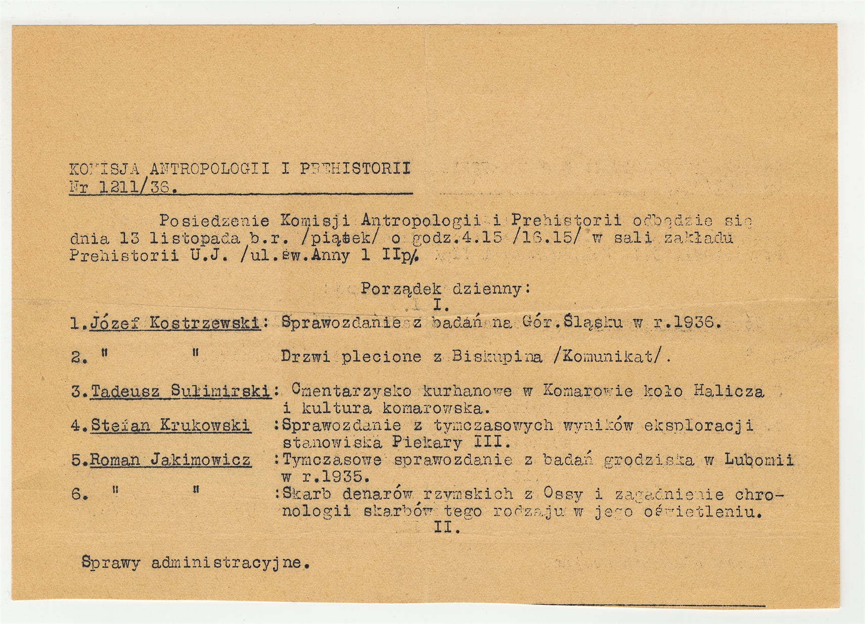 Maszynopis - program posiedzenia Komisji Antropologii i Prehistorii nr 1211/36 z dn. 13 XI 1936 r.