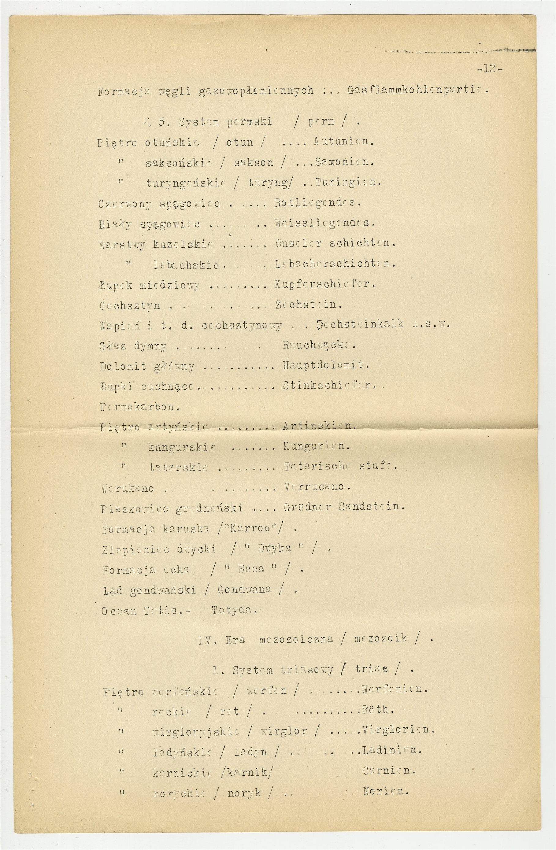 Maszynopis projektu zatytułowanego "Słownictwo Geologiczne i Paleontologiczne" przysłany do prof. Stefana Krukowskiego z Komisji do Spraw Słownictwa Geologicznego i Paleontologicznego; Rozdział: Stratygrafja (cd) - Spis terminów zasadniczych i przykładowe spolszczenie niektórych terminów lokalnych dot ery paleozoicznej (cd) mezozoicznej