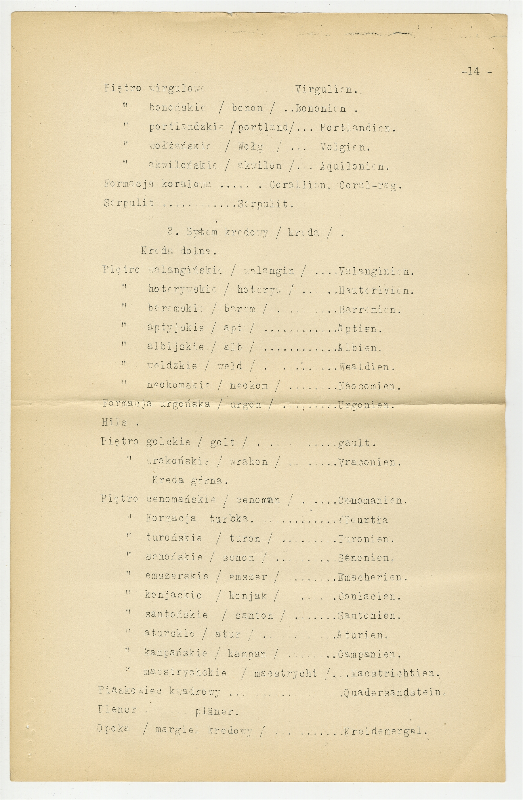 Maszynopis projektu zatytułowanego "Słownictwo Geologiczne i Paleontologiczne" przysłany do prof. Stefana Krukowskiego z Komisji do Spraw Słownictwa Geologicznego i Paleontologicznego; Rozdział: Stratygrafja (cd) - Spis terminów zasadniczych i przykładowe spolszczenie niektórych terminów lokalnych dot ery mezozoicznej (cd)