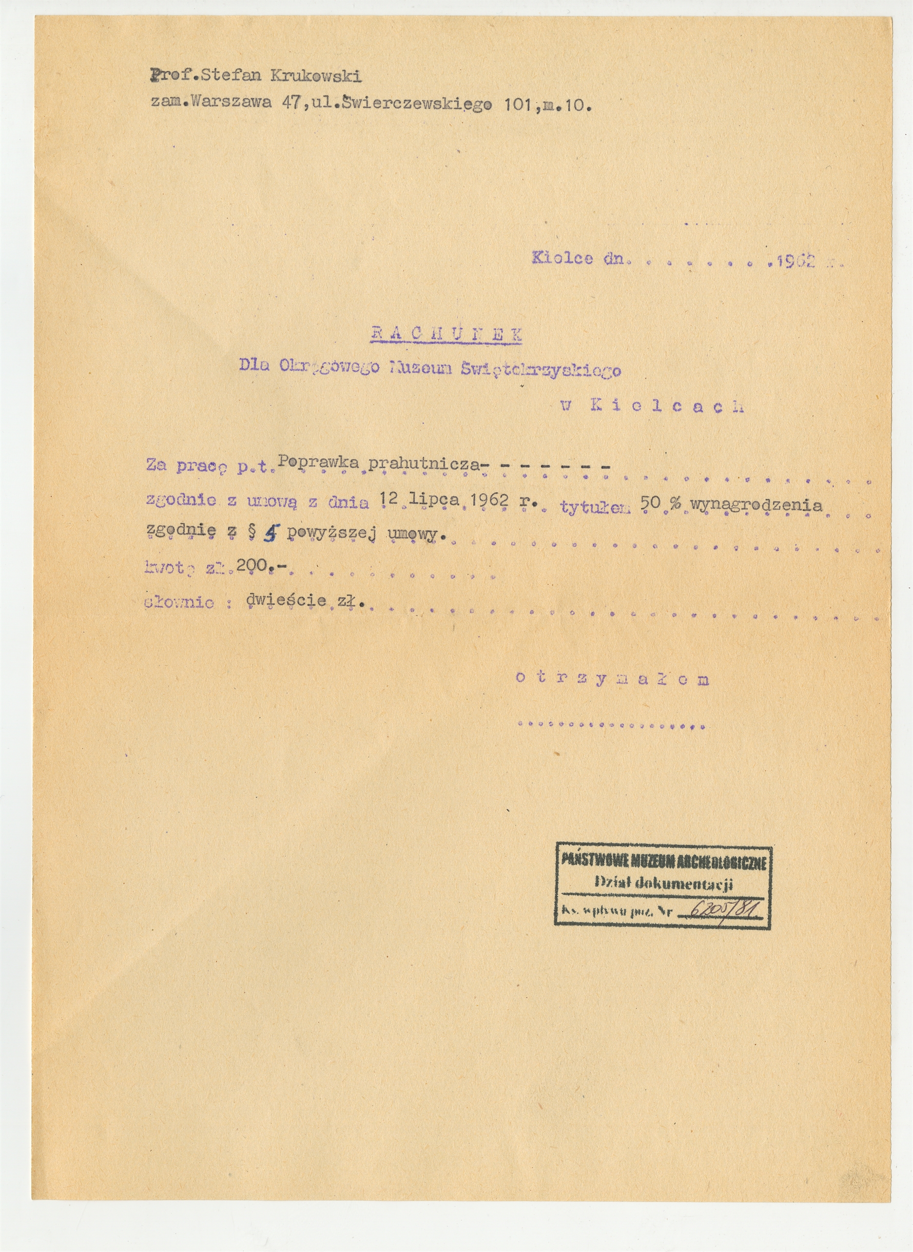 Maszynopis - rachunek przygotowany przez Muzeum Świętokrzyskie dla Stefana Krukowskiego za pracę naukową pt: "Poprawka prahutnicza" - oryginał