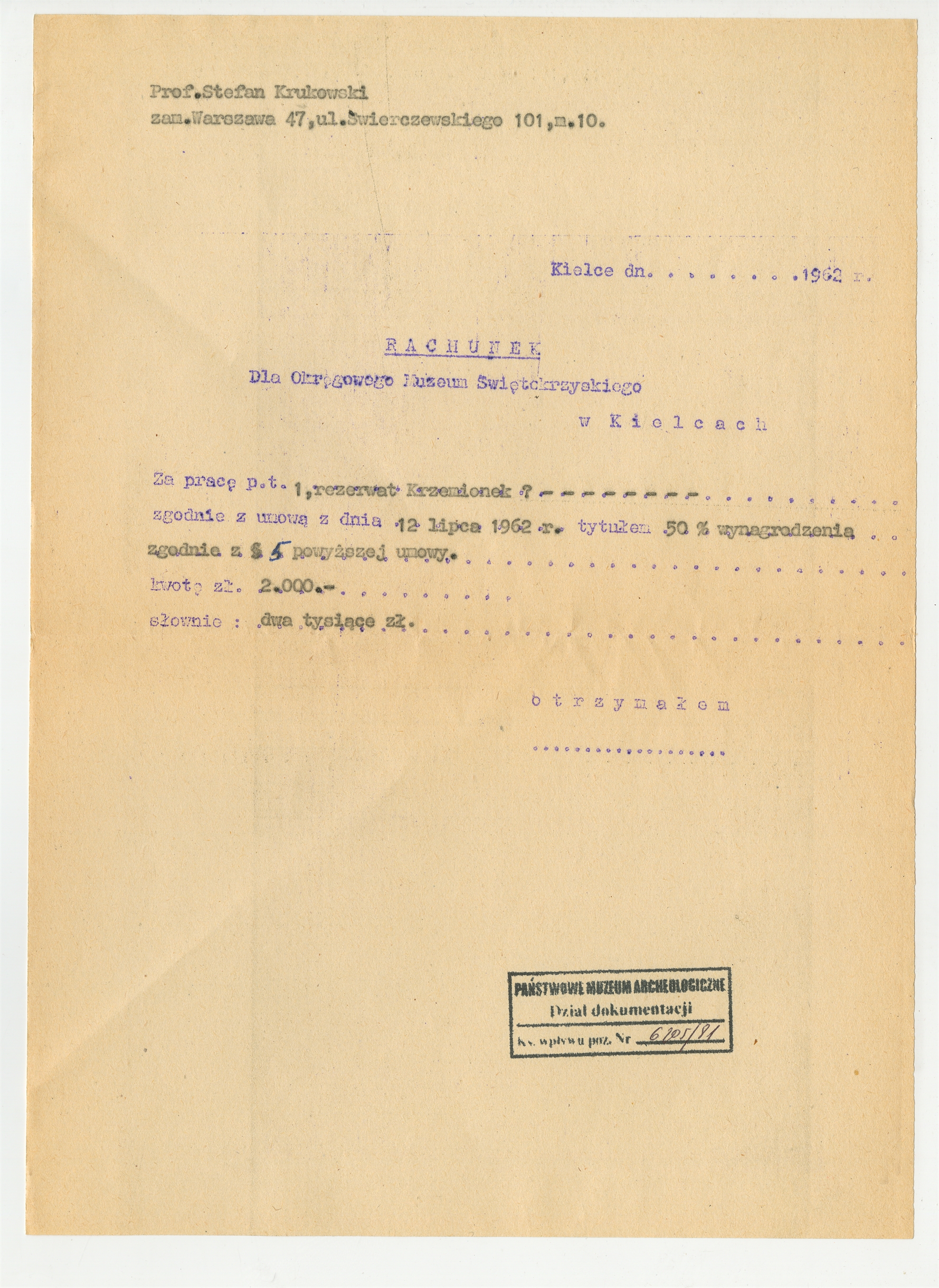 Maszynopis - rachunek przygotowany przez Muzeum Świętokrzyskie dla Stefana Krukowskiego za pracę naukową pt: "Rezerwat Krzemionek?" - kopia