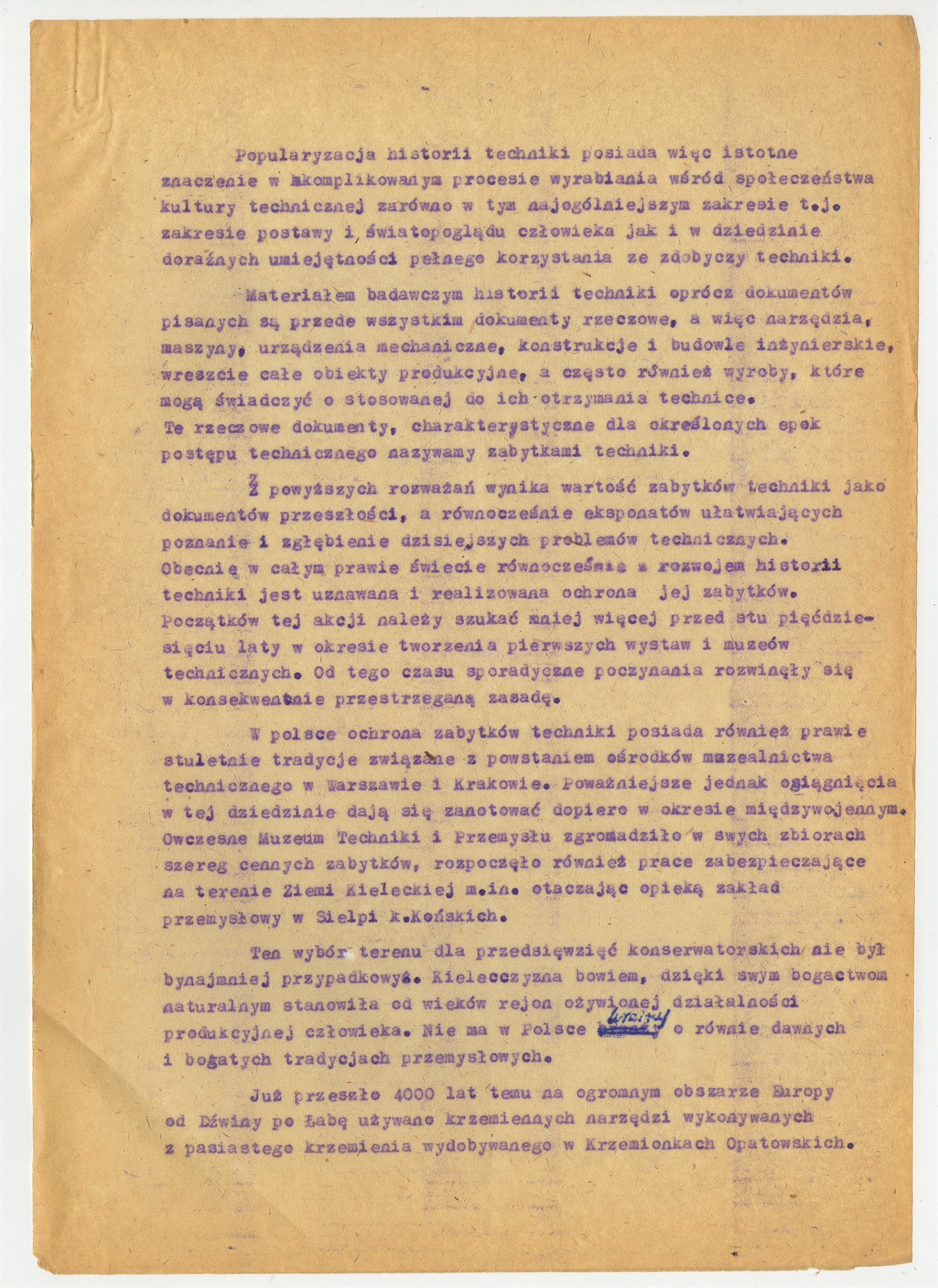 Maszynopis - referat Jerzego Jasiuka  pt.: "Zabytki techniki w woj. kieleckim i ich znaczenie dla politechnizacji" (streszczenie)  z konferencji naukowej "Problematyka Zagłębia Staropolskiego" w Kielcach  28 V 1960 roku. Strona 2