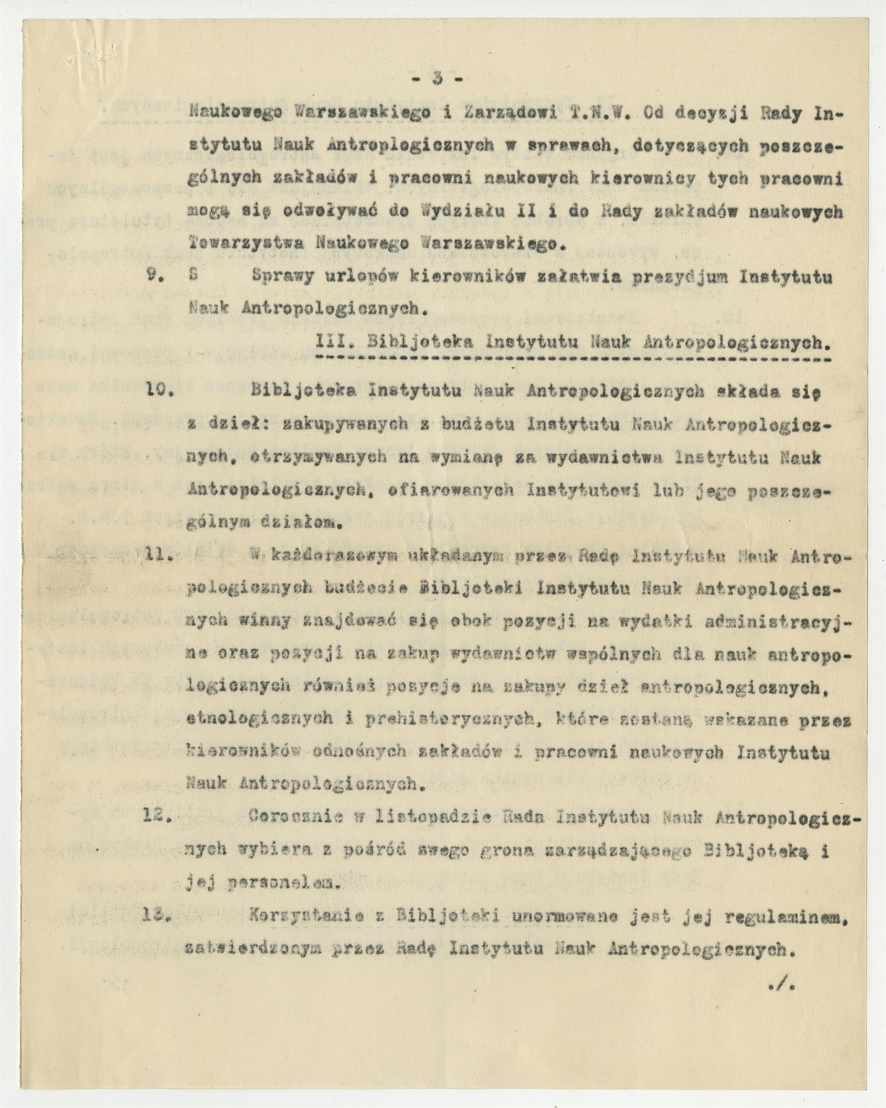 Maszynopis Regulaminu Instytutu Nauk Antropologicznych Towarzystwa Naukowego Warszawskiego zatwierdzonego przez Wydział II-gi T.N.W. dn. 29 grudnia 1922 r. - strona 3: "II. Rada Instytutu Nauk Antropologicznych" c.d. "III. Bibjoteka Instytutu Nauk Antropologicznych"