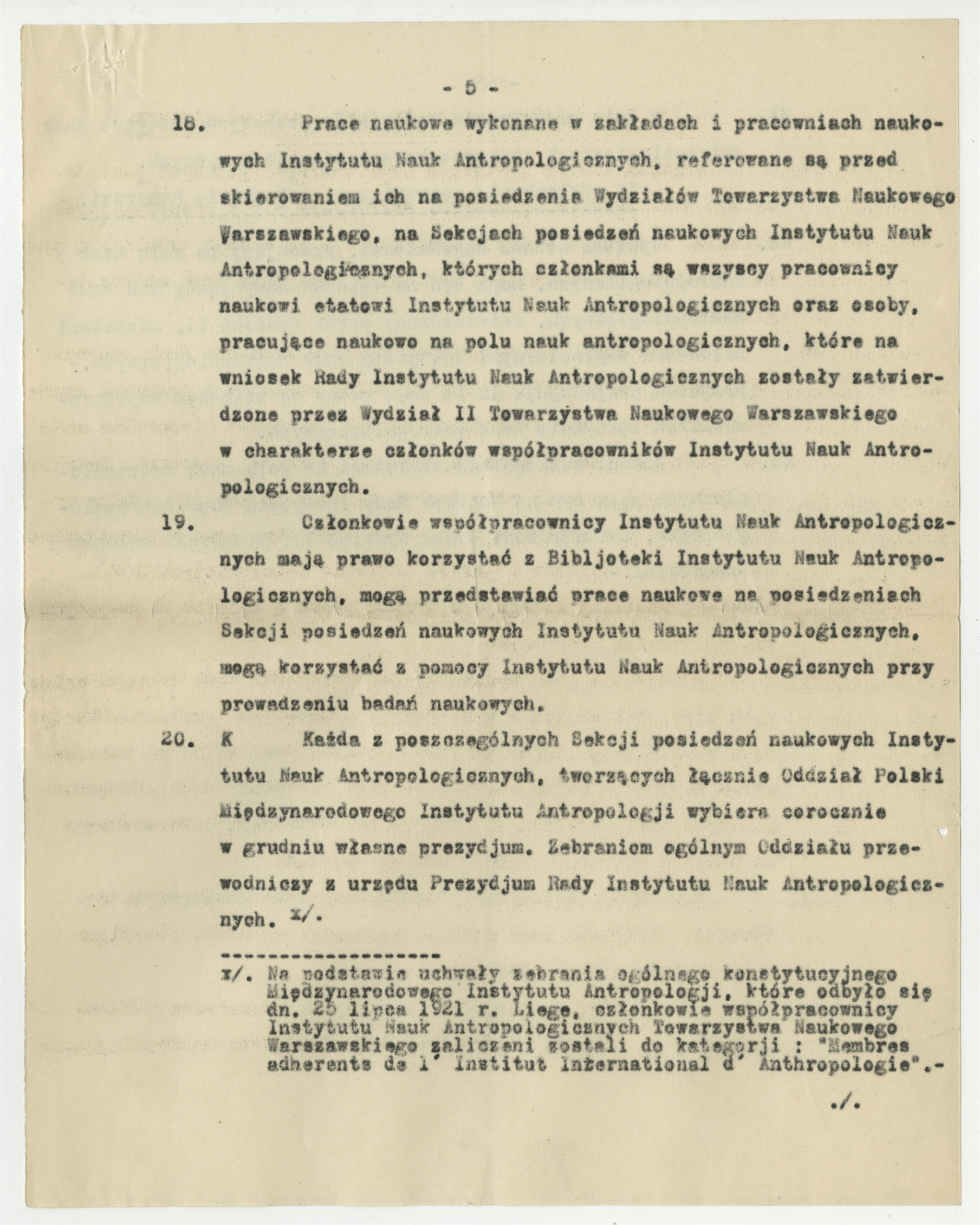 Maszynopis Regulaminu Instytutu Nauk Antropologicznych Towarzystwa Naukowego Warszawskiego zatwierdzonego przez Wydział II-gi T.N.W. dn. 29 grudnia 1922 r. - strona 5: "V. Sekcje posiedzeń naukowych" c.d.