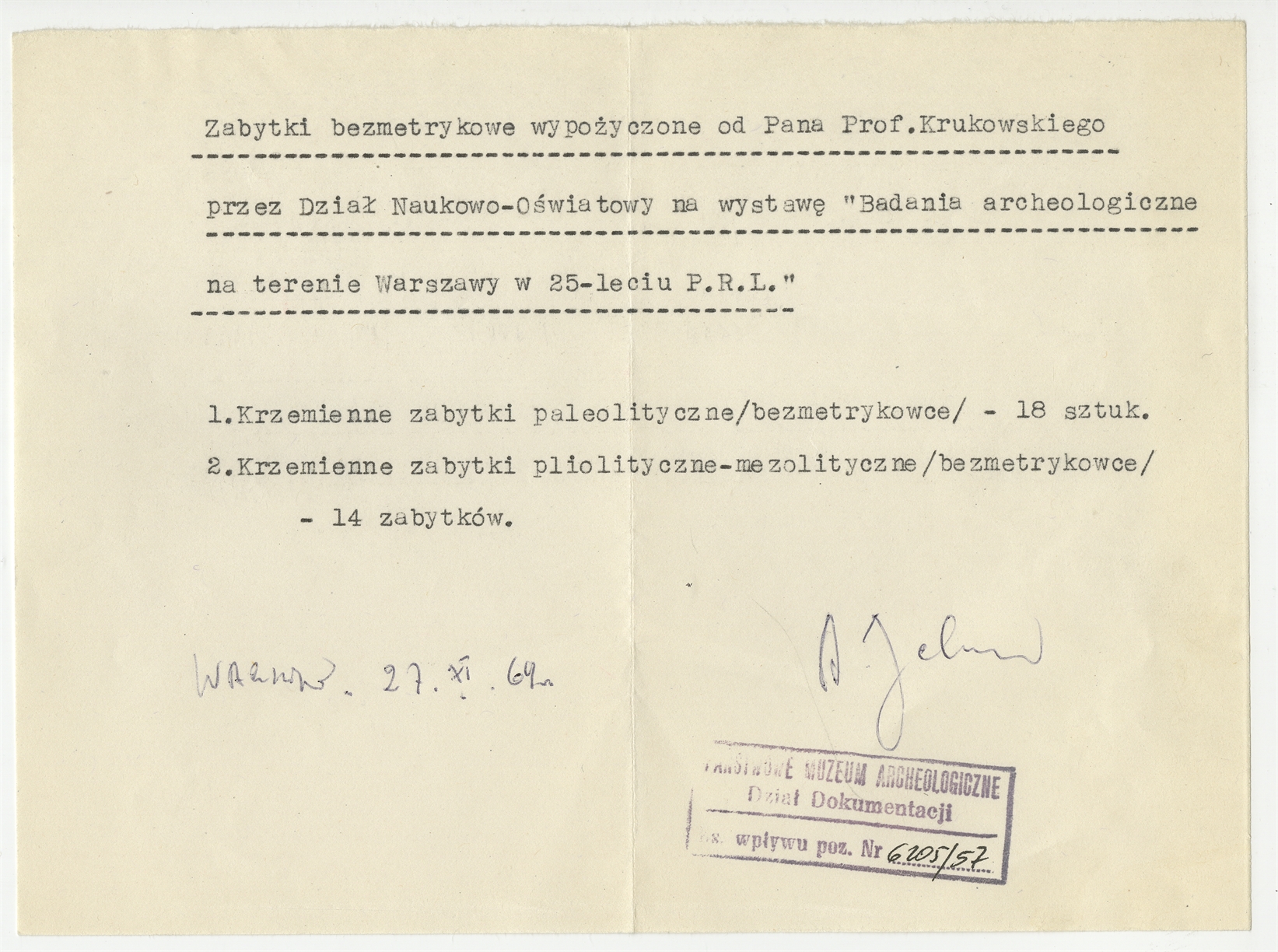 Maszynopis - rewers z dnia 27 XI [19]69 roku z wykazem zabytków bezmetrykowych wypożyczonych na wystawę przez Dział Naukowo-Oświatowy