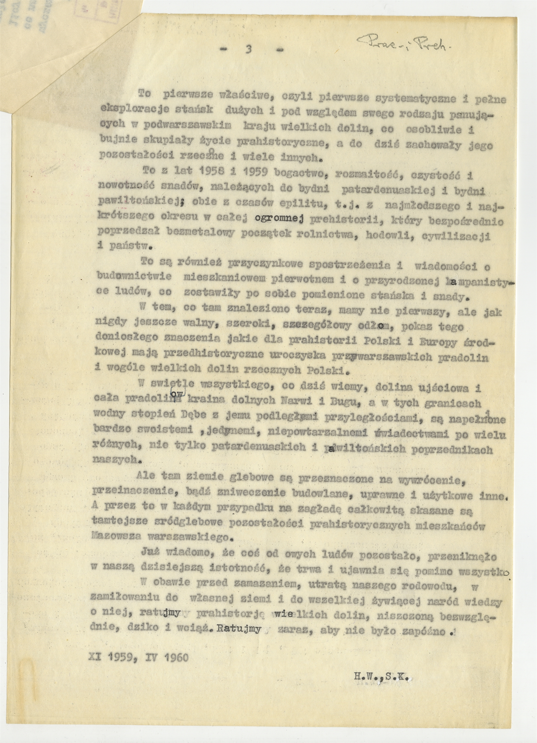 Maszynopis - „Sprawozdanie polowe z Dęba 1959. wydanie drugie” autorska numeracja 3 str. 3: „To pierwsze właściwe czyli pierwsze systematyczne i pełne eksploracje (...)”
