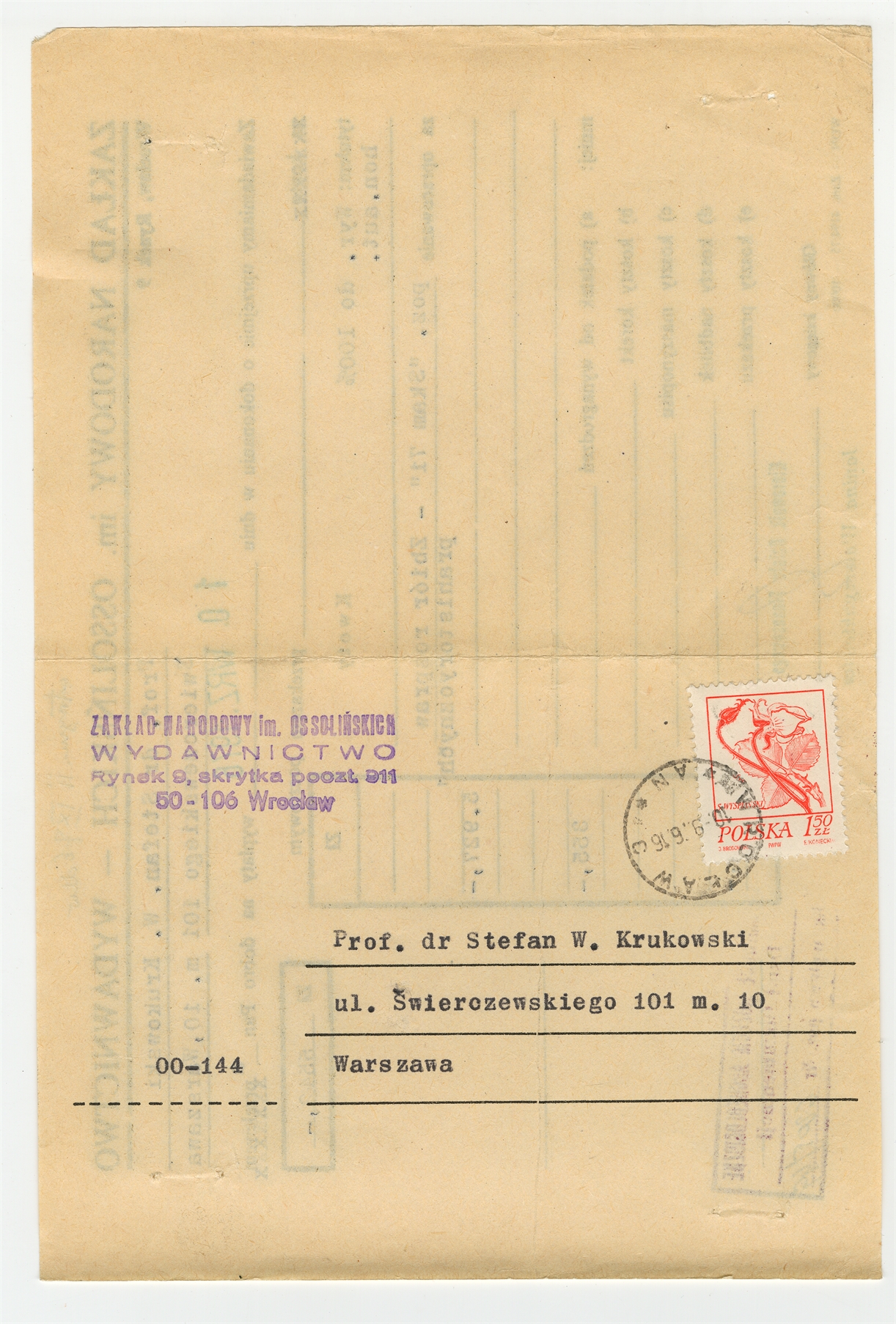 Maszynopis - strona adresowa Zakładu Narodowego im. Ossolińskich do Stefana Krukowskiego - awers