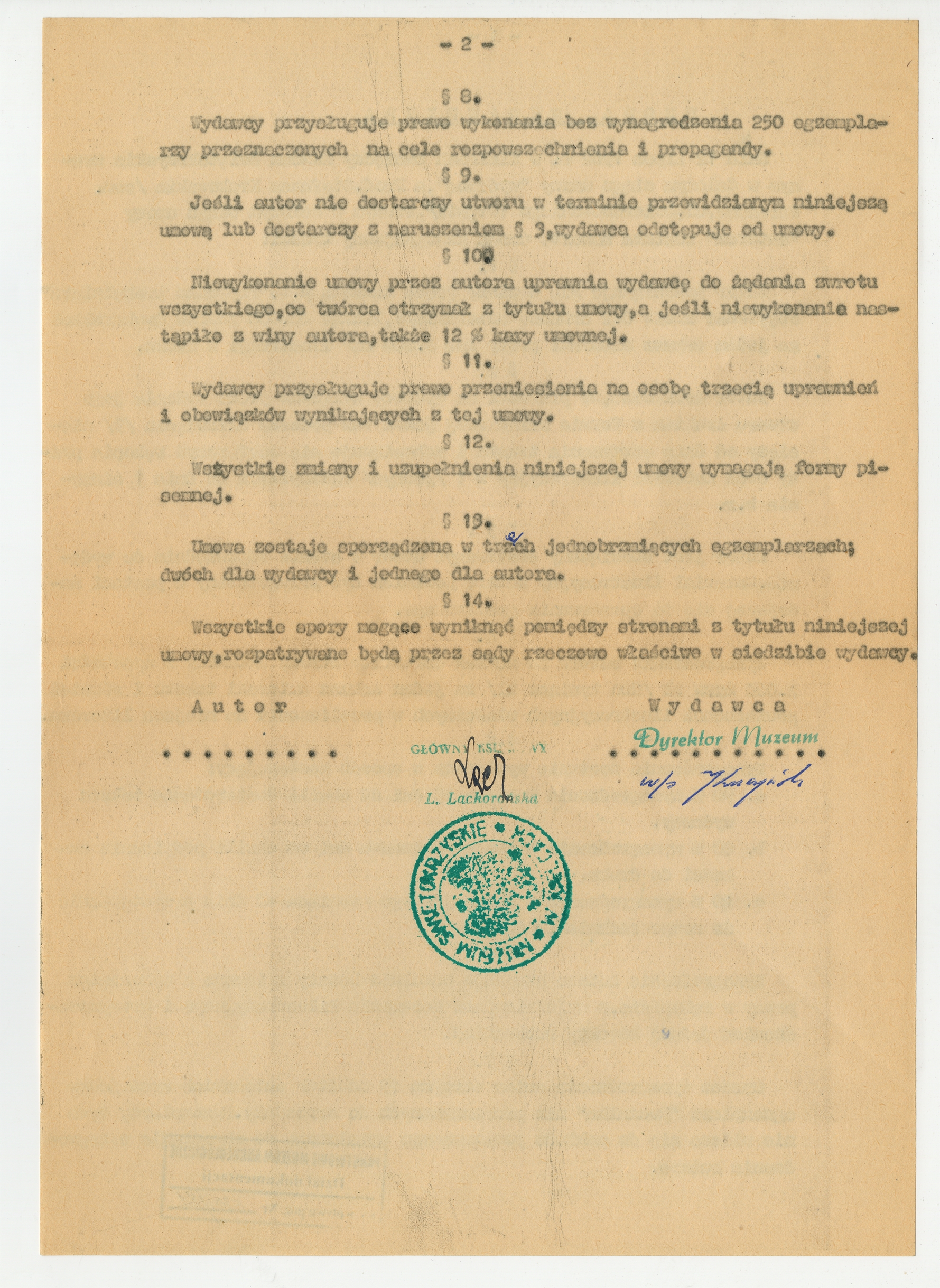 Maszynopis - umowa wydawnicza przygotowana przez Muzeum Świętokrzyskie dla Stefana Krukowskiego na pracę naukową pt: "Poprawka prahutnicza" - druga kopia strona 2