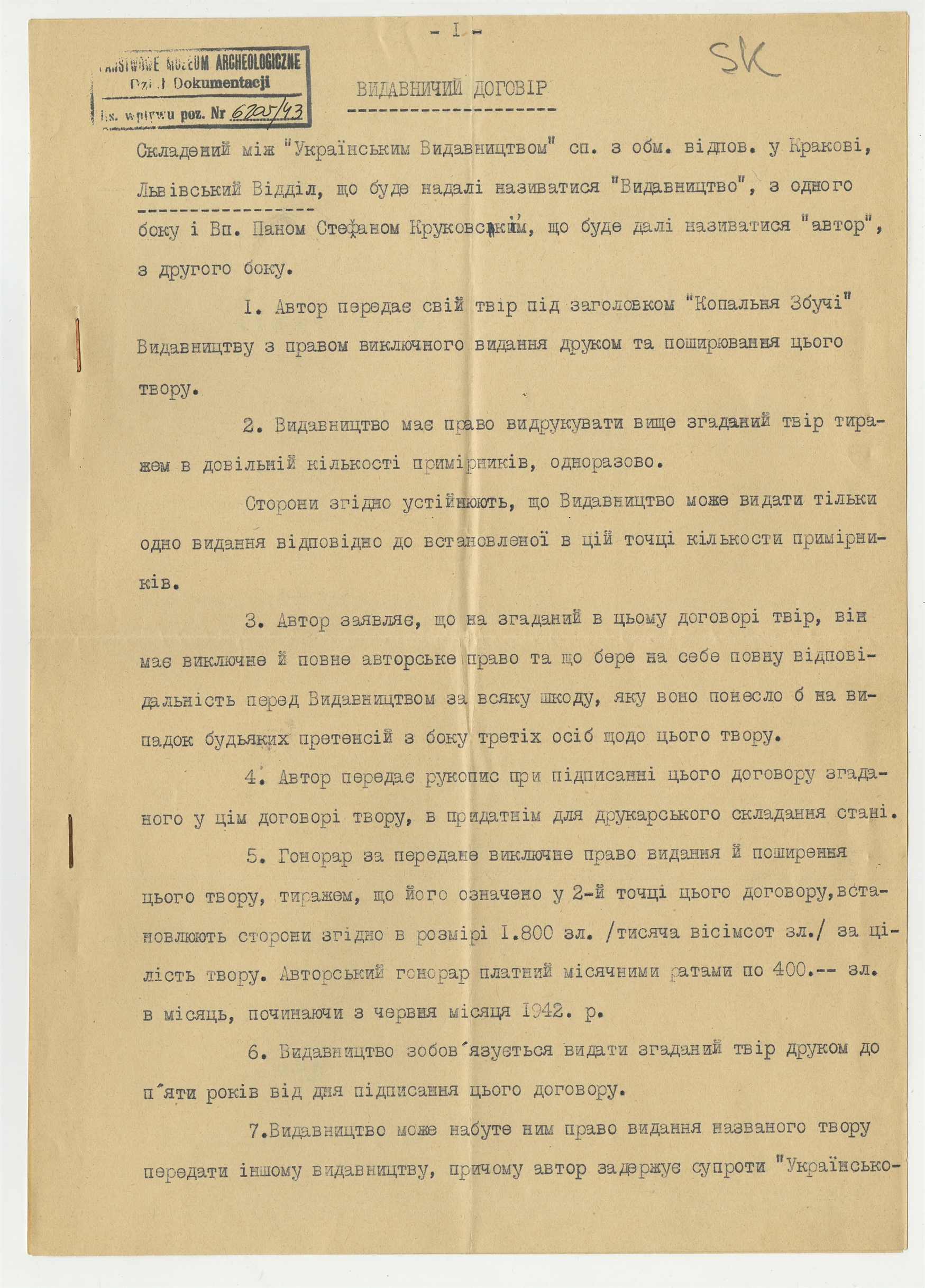 Maszynopis - umowa wydawnicza w języku ukraińskim zawarta 16 czerwca 1942 pomiędzy wydawnictwem ????????? ??????????? a Stefanem Krukowskim na wydanie pracy "???????? ?????" - strona 1