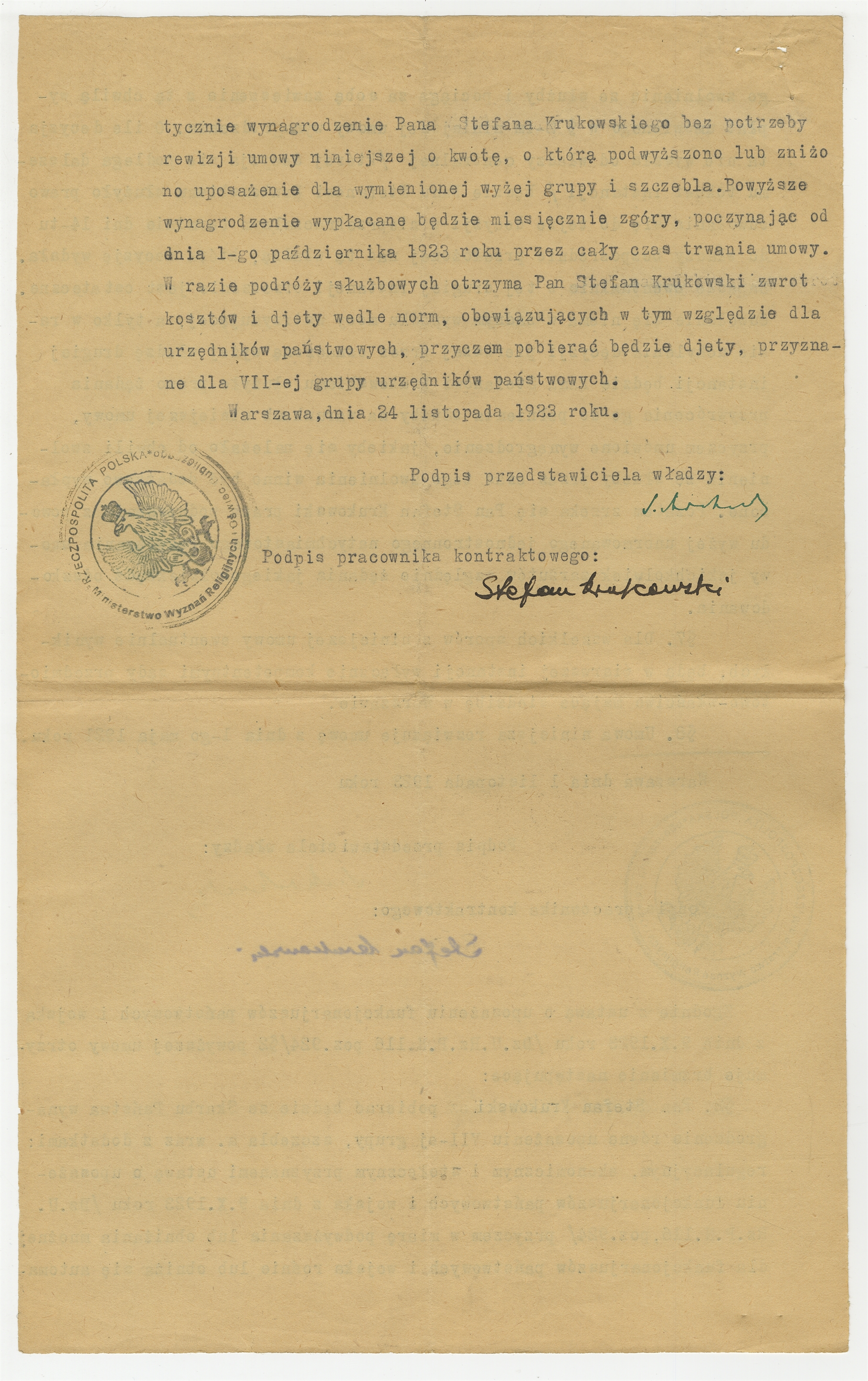 Maszynopis umowy zawartej między Stanisławem Michalskim Naczelnikiem Wydziału Nauki Ministerstwa Wyznań Religijnych i Oświecenia Publicznego a Stefanem Krukowskim w sprawie zatrudnienia Krukowskiego na stanowisku Konserwatora Zabytków Przedhistorycznych na województwa Łódzkie i Kieleckie Warszawa 1 4 listopada 1923 r. - strona 4: paragraf 2 w nowym brzmieniu c.d.