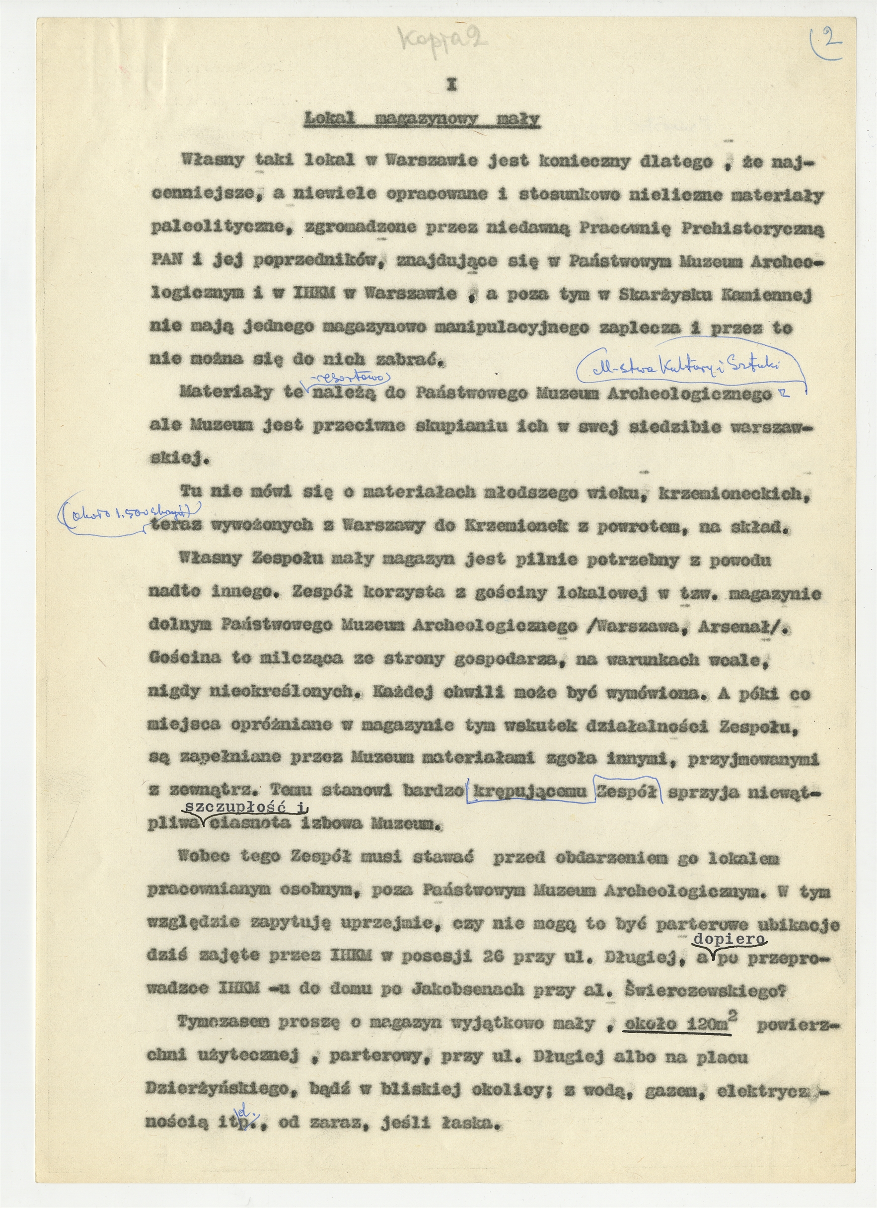 Maszynopis wniosku sporządzonego przez Zespół Prehistorii przy Muzeum Ziemi PAN do Sekretarza Wydziału I PAN w Warszawie prof. dr J. Chałasińskiego w sprawie "lokalu magazynowego małego" "rozkopów ratowniczych uzupełniajacych i zastępczych" "daodatku na pomnożenie ilustracji do rozpraw" - strona 2: zatytułowana "Lokal magazynowy mały" "Własny taki lokal" ... "od zaraz jeśli łaska" (autorska strona 2)